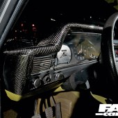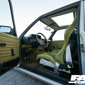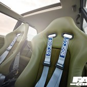Full interior retrim in custom ‘old skool’ green finish; carbon Bride sports seats re-trimmed to suit; full carbon dash; Sparco seat belts; new fuel tank relocated to boot.