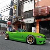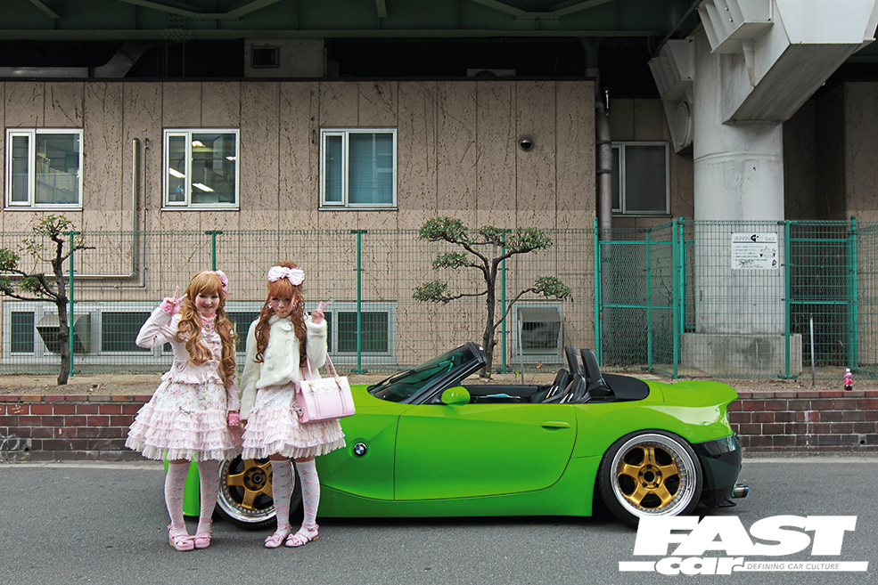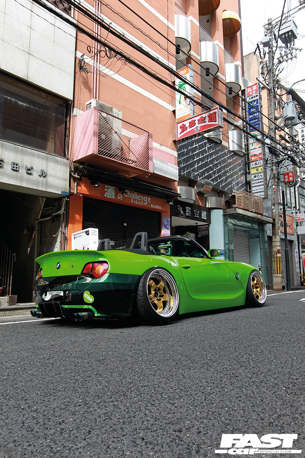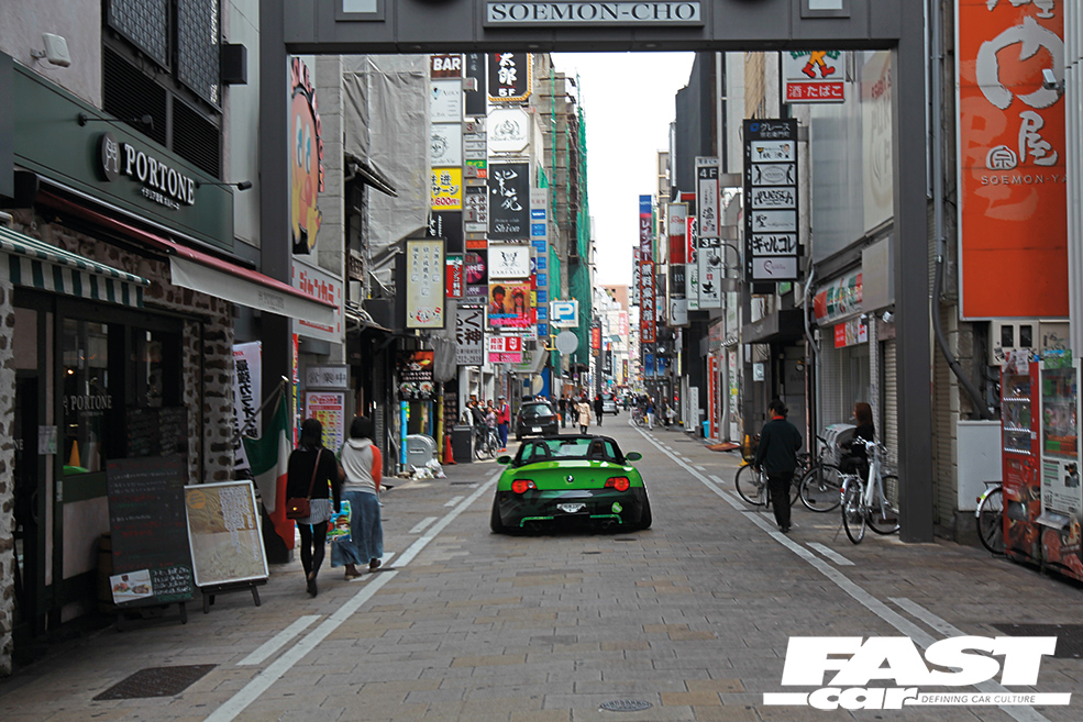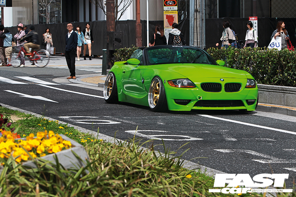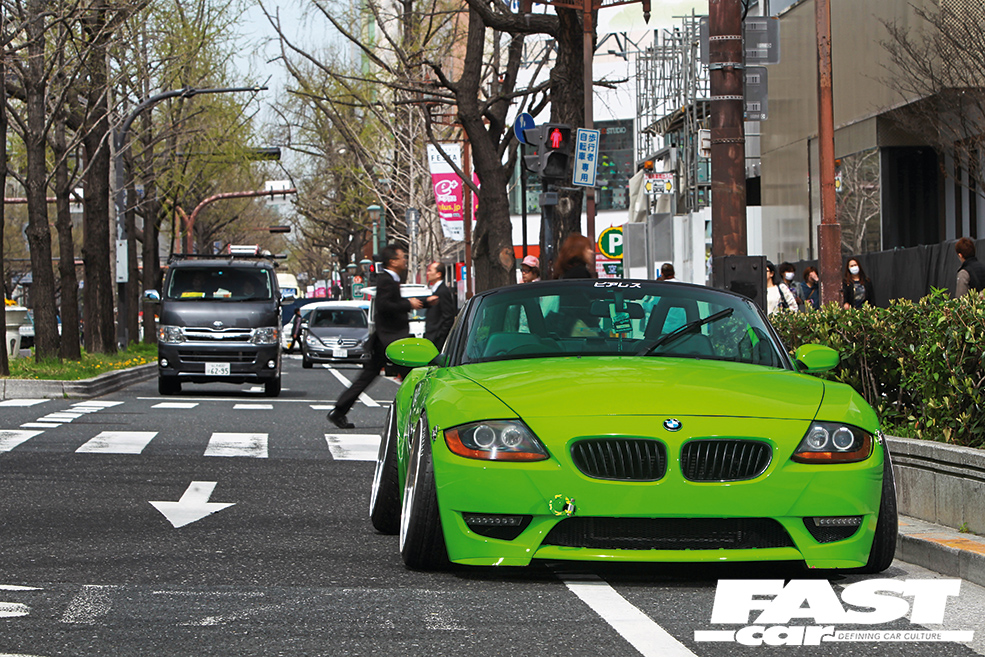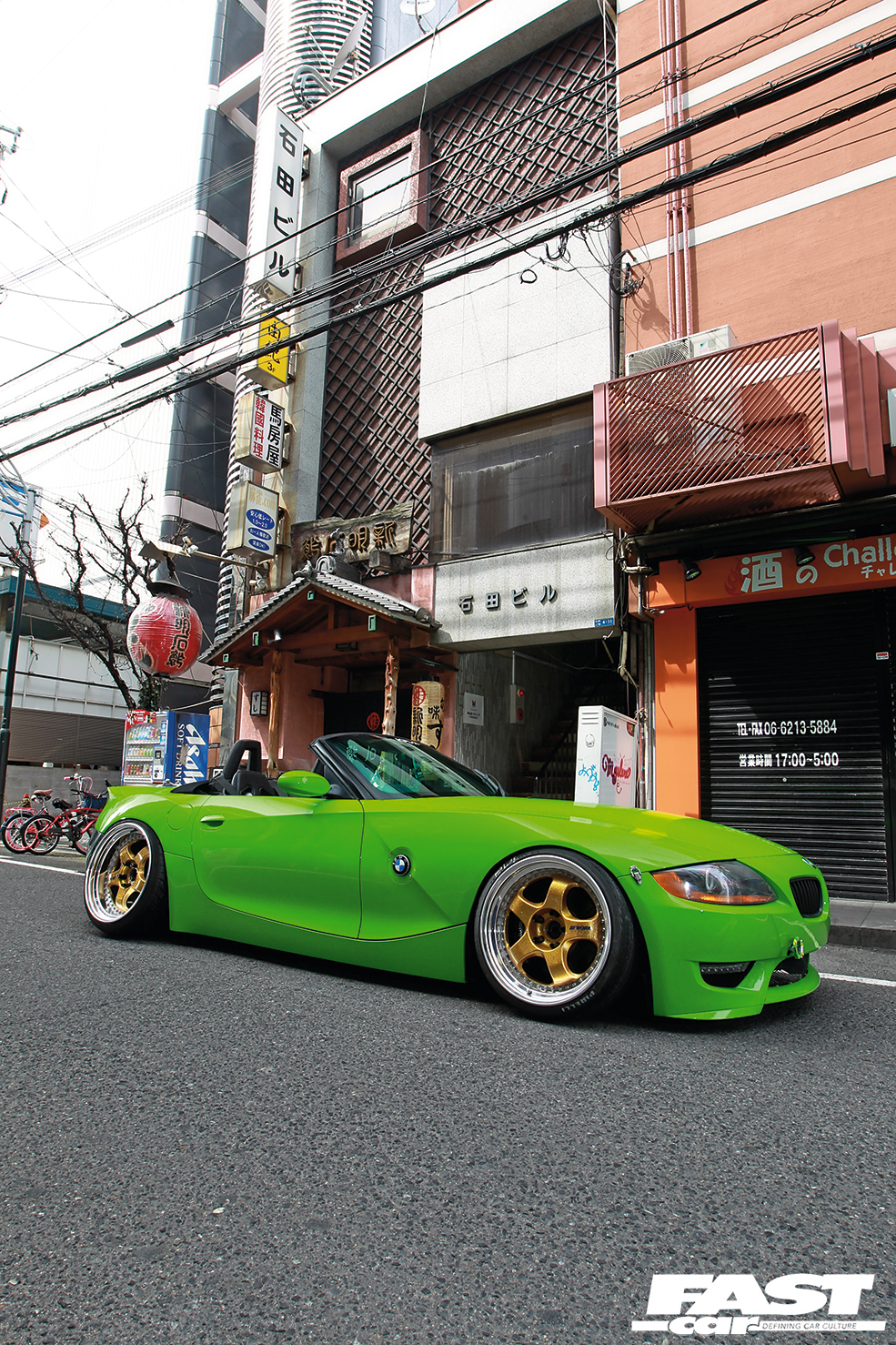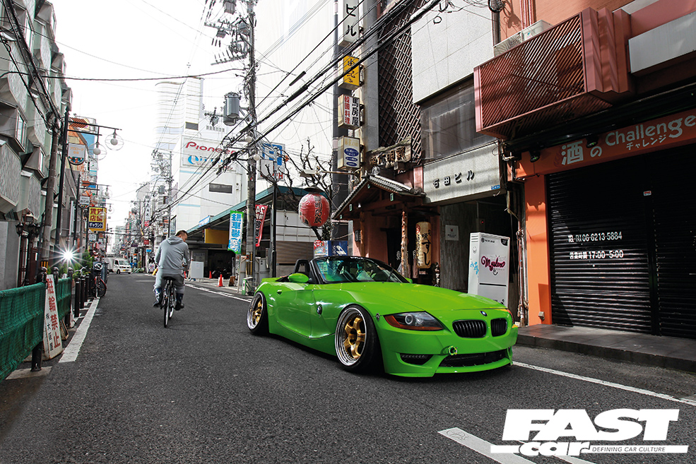 So there I was, sitting in the busiest and most uptown district of Osaka – Shinsaibashi – shooting a German car, done up in the Japanese interpretation of a US style. The best way to describe Mizote-san’s Kawasaki-green Z4 is probably to call it the automotive equivalent of a cocktail – it’s sweet, colourful and served up in a very decorative manner.