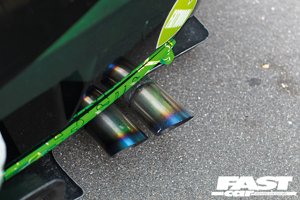To get the appropriate level of negative camber (i.e shitloads! – Jules) Peerless fitted their front lower arms and tie rods, set to push the wheels out to minus 9-degrees. Pretty extreme. However, the rear runs what in Japan is referred to as onikyan or ‘devil camber.’ Roughly anything over minus 10-degrees qualifies, so at -13 the rear wheels are certainly within the range. The Peerless rear control arms, together with a set of SPC adjustable rear camber arms make this madness possible.