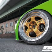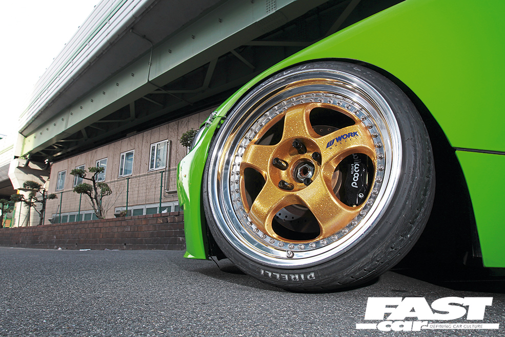 Neither Mizote, nor Nakata had any intentions of disclosing the offset of the Meister S1 3-piece rims. They ordered them from Work Wheels with custom offsets – something that has always made this particular Japanese wheel maker popular with those in the stance and show car scenes. The wheels, which were then custom painted in metallic gold flake, were wrapped in tightly stretched Pirelli rubber.