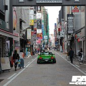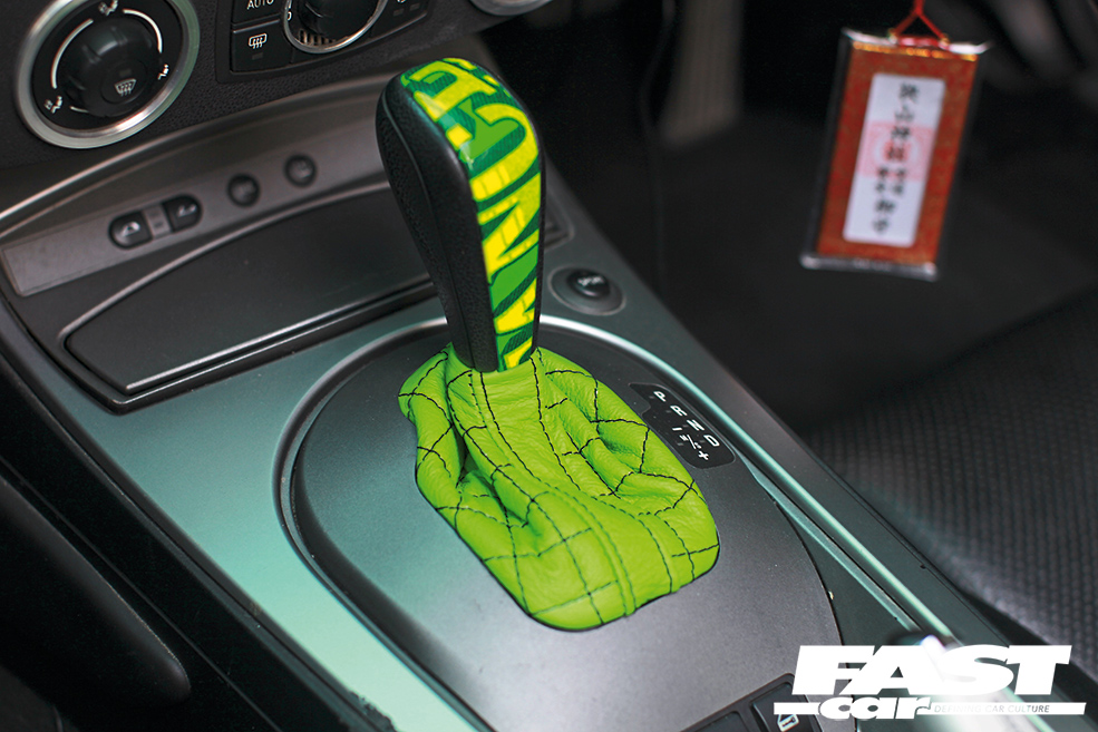 As we move into the quieter backstreets, around the corner from Dotonbori, we take some more time to appreciate the Z4’s interior. Here you can appreciate the colour coordination, with splashes of fluorescent green on the shifter and handbrake leather as well as custom printed graphics for the door handles and dashboard trims.