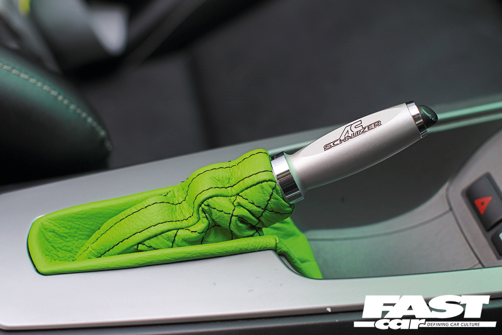 M Roadster front bumper, LED DLRs, widened front fenders (+3cm), LSD vertical door conversion, widened rear fenders (+4 cm), Hamann rear bumper, S15 Silvia rear diffuser, extended and integrated Alpina rear lip spoiler, Kawasaki Lime Green paint, custom graphics