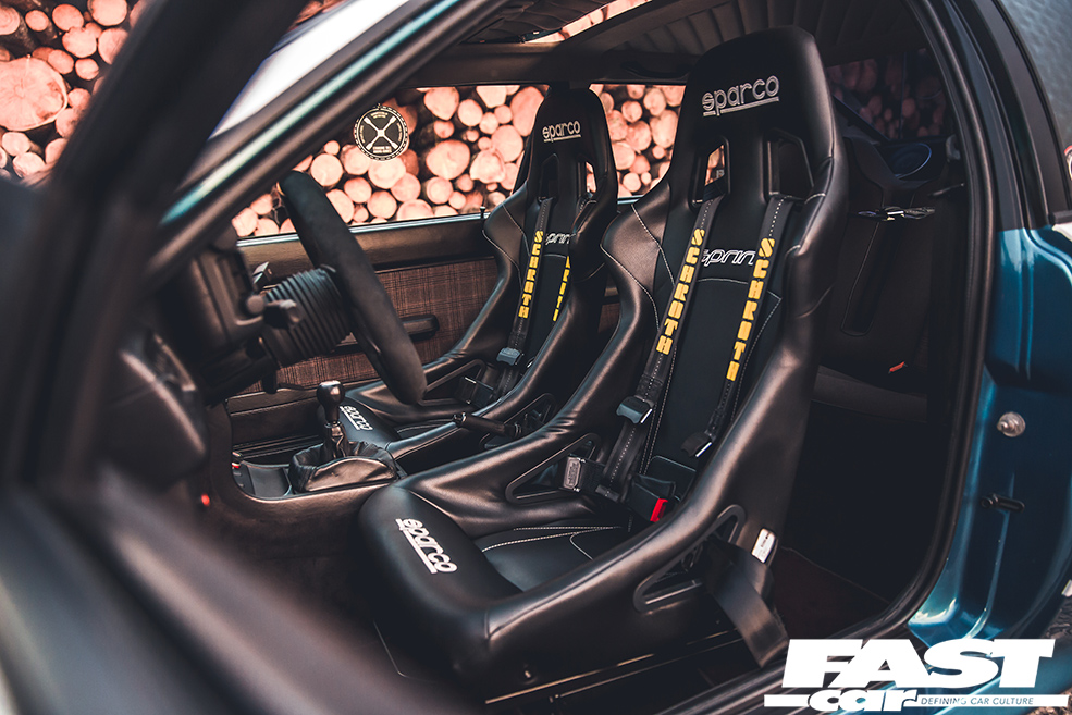 And, with all of that rally magic going on outside, it’d be a shame to leave the innards untouched, wouldn’t it? So inside, basking in the eerie green glow of that fabulous dash, you’ll now find Sparco Sprint seats with Schroth 3-point harnesses, and a grippy Sparco wheel to match.