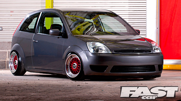 BBS RM 004 8×15 fronts and 8.5×15 rears; Candy Red centres and polished outer lip; 165/45×15 Bridgestone Potenza tyres stretched all round; AP coilovers with custom -110mm springs all round.
