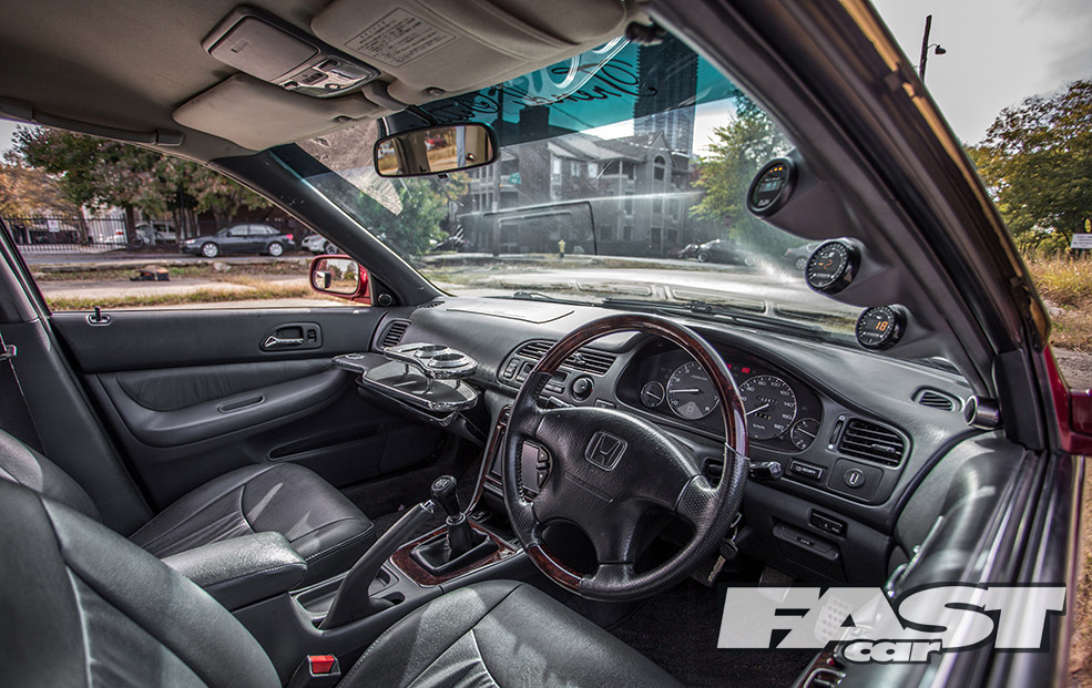 JDM leather seat conversion with matching leather doorcards; custom LED door lights; retrofitted Digital Climate Control; Acura MDX wheel with functioning audio controls; Acura CL wood grain console insert; Panasonic HU with rear view camera; JDM SiR gauges; Accord sills guards; half-mast antenna; cup holder and custom table; custom RHD pillar gauge pod with PLX wideband gauge and Inovate boost and oil gauges; Odyssey overhead sunglass holder with working Homelink for garage doors.
