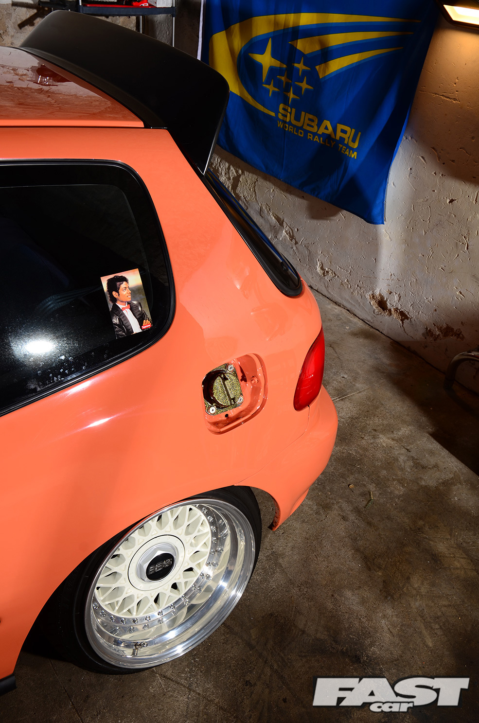Peach paint, smoothed front bumper, smoothed JDM tailgate, M3 mirrors, aerial deleted and smoothed, widened front wings, USDM sidelights, all-red taillights, fuel cap delete with gold glittery paint fuel cap neck, BYC ducktail spoiler, EG SR front lip, H8 EG X private plate
