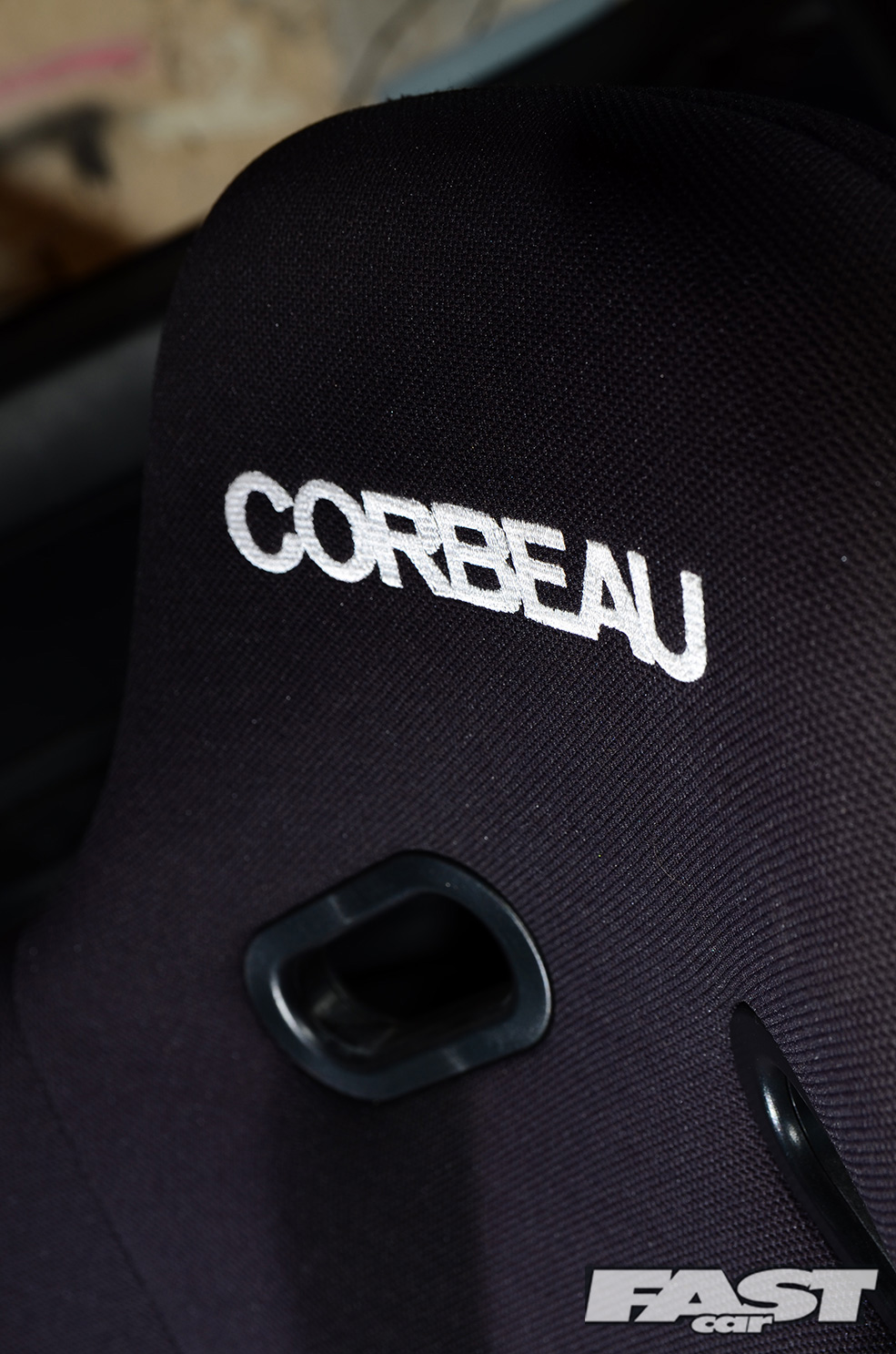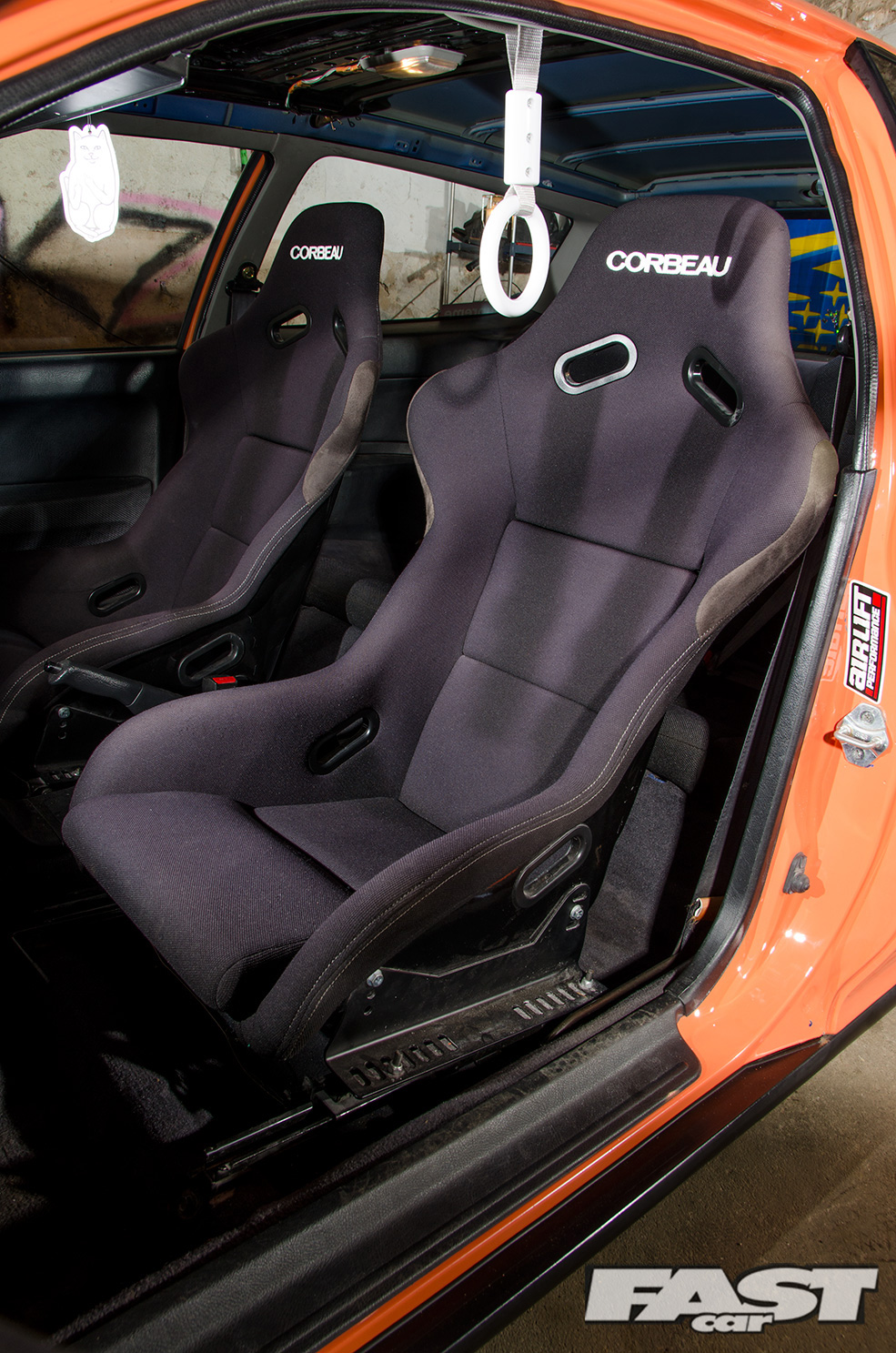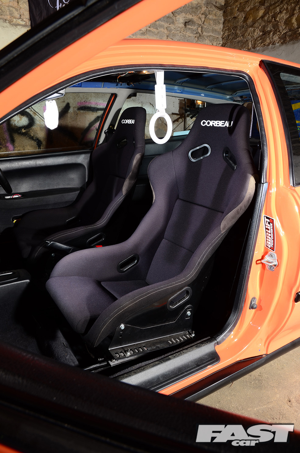 Corbeau fixed bucket seats, DC2 Recaro rear seats, black plastics, Mountney 10″ steering wheel with quick-release boss, upgraded door speakers and head unit, simple boot build