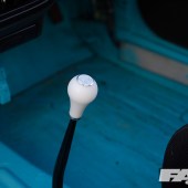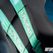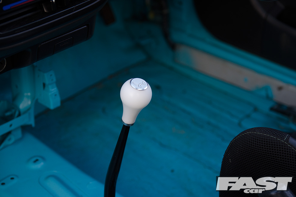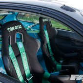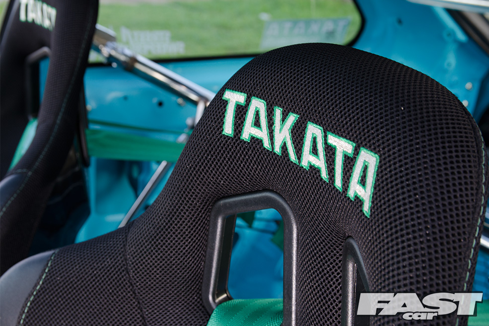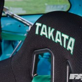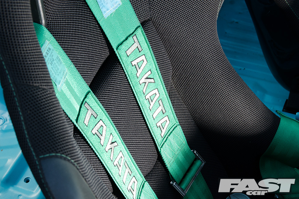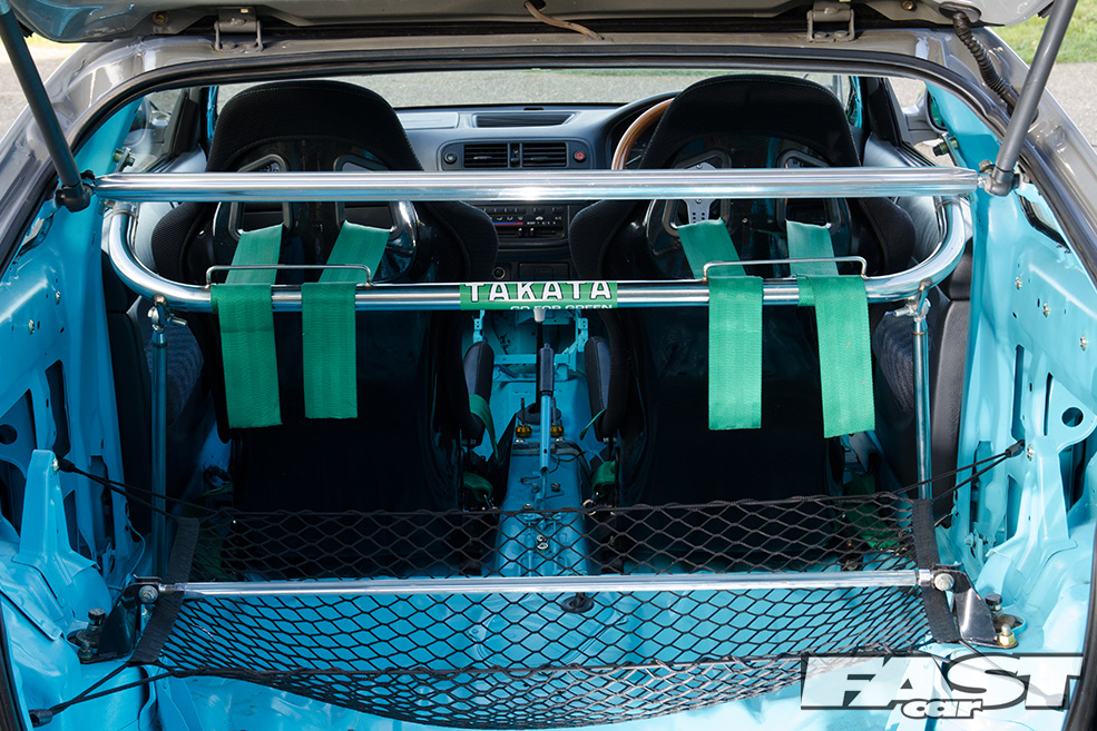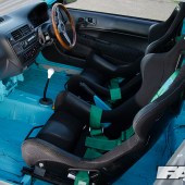 Takata bucket seats, ultra-low seat rails, Takata MPH-341 4-point harnesses, harness bar, rear strut brace, cargo net, fully stripped and painted Cyan Gloss, Momo wooden steering wheel and boss, Hybrid Racing gearknob
