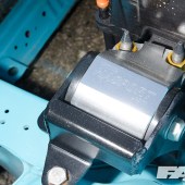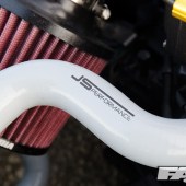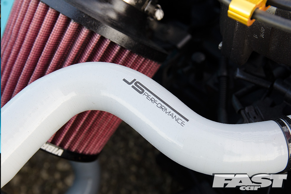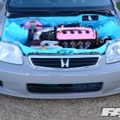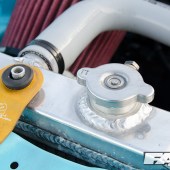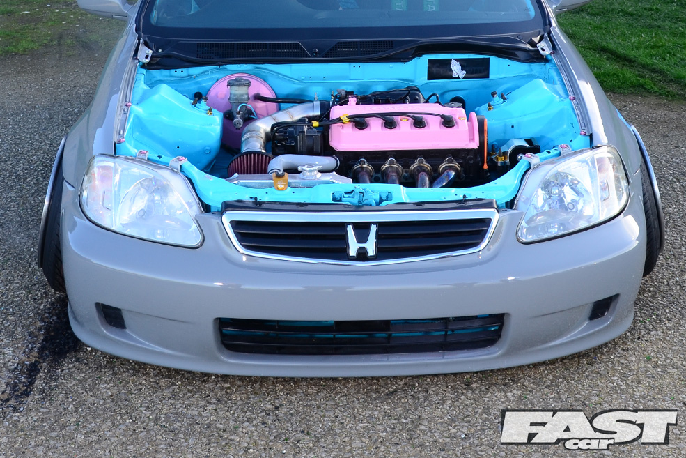 It’s at this point that GizFab enter the scene – a Skegness-based company who carry out custom fabrication work. Simon delivered the Civic to them along with an ambitious wishlist, and returned a week later to find some shiny new bits and lots of cunning mods on the car: shortened front camber arms, a shortened manifold and tucked-up exhaust centre section, the necessary engine raise, a 3” intake with Vibrant filter, turret tops re-welded, and a tie-down box fitted for the new battery location in the passenger footwell.
