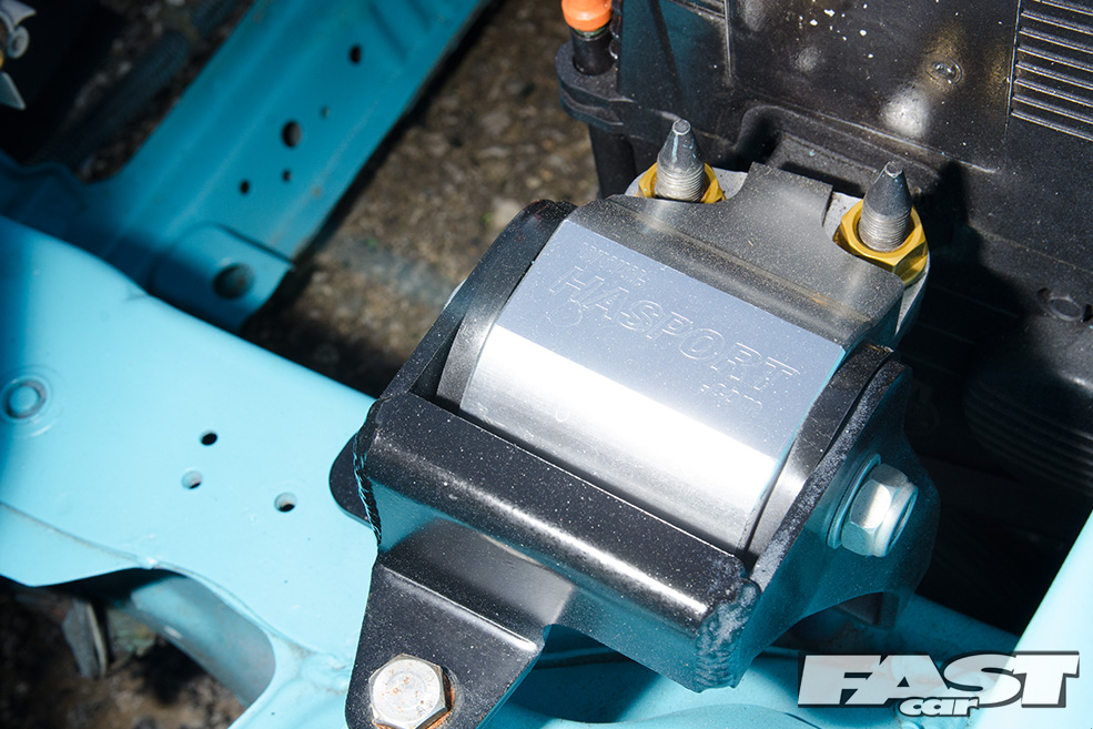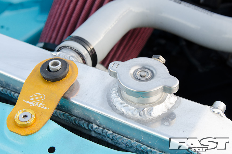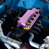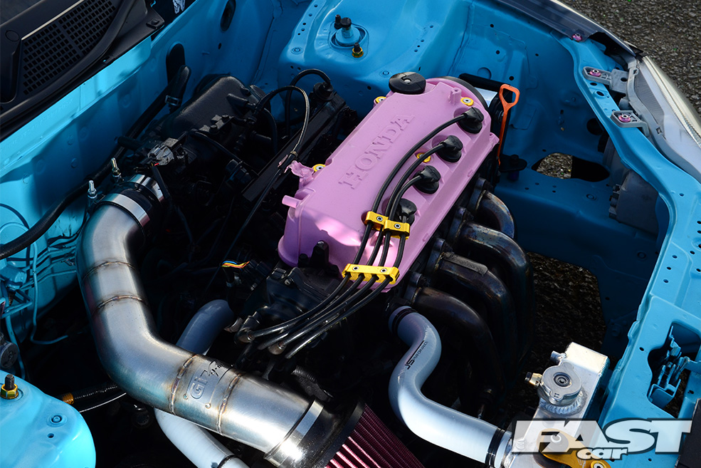 D14A4 1.4-litre SOHC, D16 inlet, custom 3” intake with Vibrant filter, 4-2-1 shortened manifold, billet engine mounts, custom engine raise, full Buddy Club Spec 2 exhaust system, aluminium radiator and slimline fan, Hybrid Racing oil cap, various dress-up bolts, JS Performance hoses