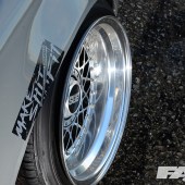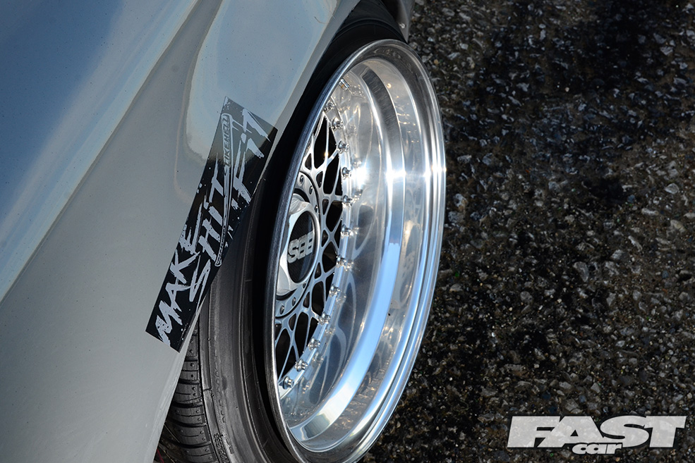 9.5×15” (front) and 10.5×15” (rear) BBS RM wheels, 185/45 (f) and 195/45 (r) tyres, BC coilovers with custom spring rates, extended lower control arms, shortened front spindles, Skunk2 Pro Series front camber arms – modified and shortened, rear camber arms shortened, Skunk2 rear lower control arms, BWR subframe brace