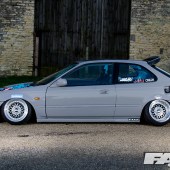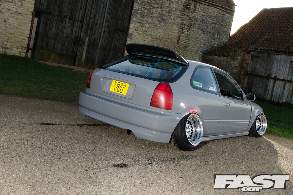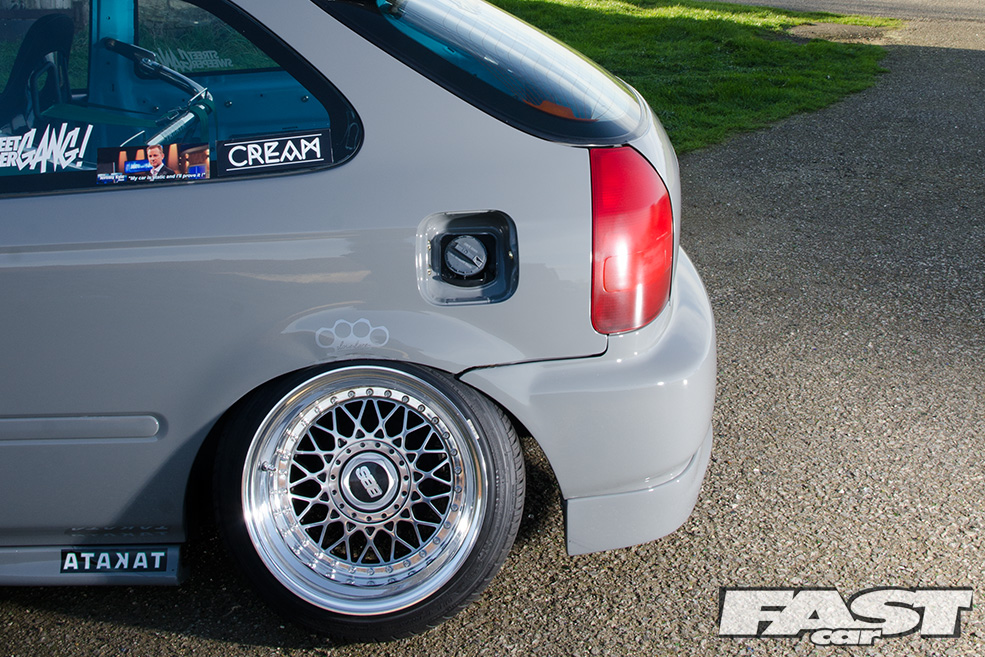 “At this point, I couldn’t help but think it needed a special set of wheels,” Simon continues. “A good friend of mine had just finished building some BBS for his EK coupé on hydros; he’d seen a new project car he wanted to buy, so after a few phone calls I was on my way to collect them. They barely fit on a car on hydros, let alone a static car! I bolted the wheels on and they were nowhere near fitting; with a lot more cutting and a lot more rolling we were just about there. But with a brief test-drive up the road, the car felt like it was ripping itself apart. After a bit of investigation it turned out that, thanks to the engine raise and extra camber, the driveshafts where binding, so my options were shortened shafts or more camber…and you know the answer to that one!”