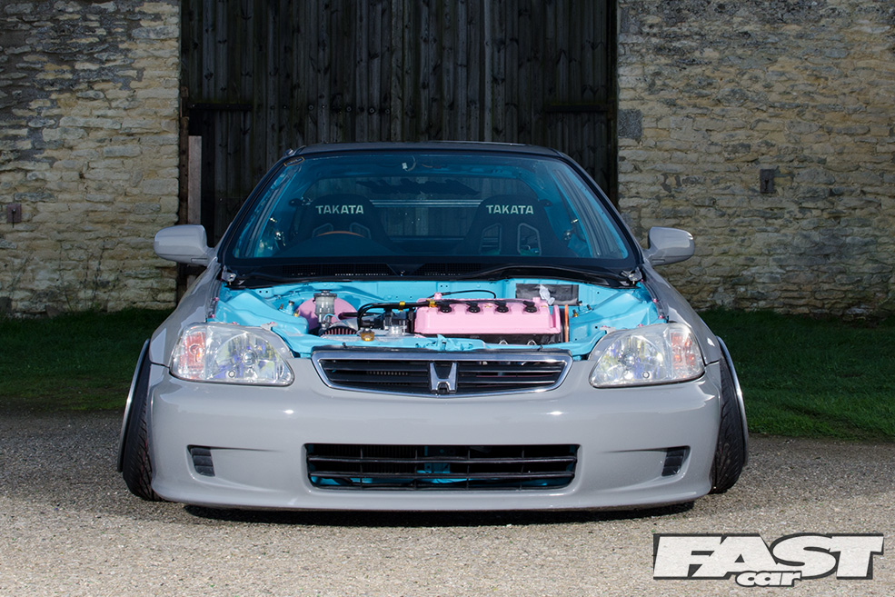 “The car is for show use only, and driving to and from and shows,” he admits. “The amount of attention it draws on the road is ridiculous though; I thought it was mad enough in a bright, loud, mint-green Type R, but this is on another level. Pull up in a petrol station and people follow you in to take photos. On one occasion, the pump operator wouldn’t activate the pump so I had to go in, and they asked if the car could even move! Yeah, obviously, I just drove it in here! There have been a few disasters along the way too, like losing my exhaust on the A1, running over splitters and totally folding front wings, but the end result has all been worth it. Yes, I only bought it as a budget build as a bit of fun, but once the modifying bug gets back in you, you can’t help yourself!”