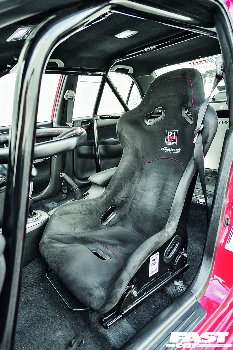 It’s worth bearing in mind that this has always remained a streetable car, too – 518whp is a mighty and slightly silly figure, enough to go obscenely fast; yes, we’ve seen far more from the 4G63, but those massive-power builds are usually drag cars and far from daily-drivers. Sergio’s taken a methodical approach here to keep it all usable. The exemplary chassis setup helps a lot – Stance+ coilovers tie in with a full suite of Ultra Racing chassis braces and Whiteline anti-roll bars to ensure that while it’s all stiff and race-car precise, it’s also smooth and compliant when it needs to be. So he can give the opposition hell on track, or he can just cruise to the shops and pick up a drive-thru on the way home.
