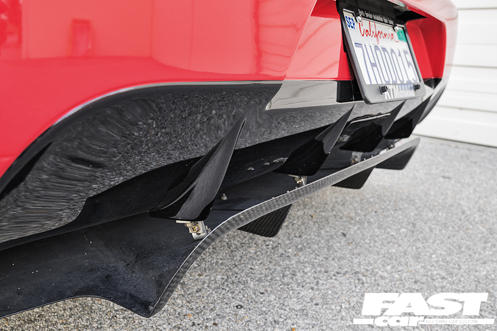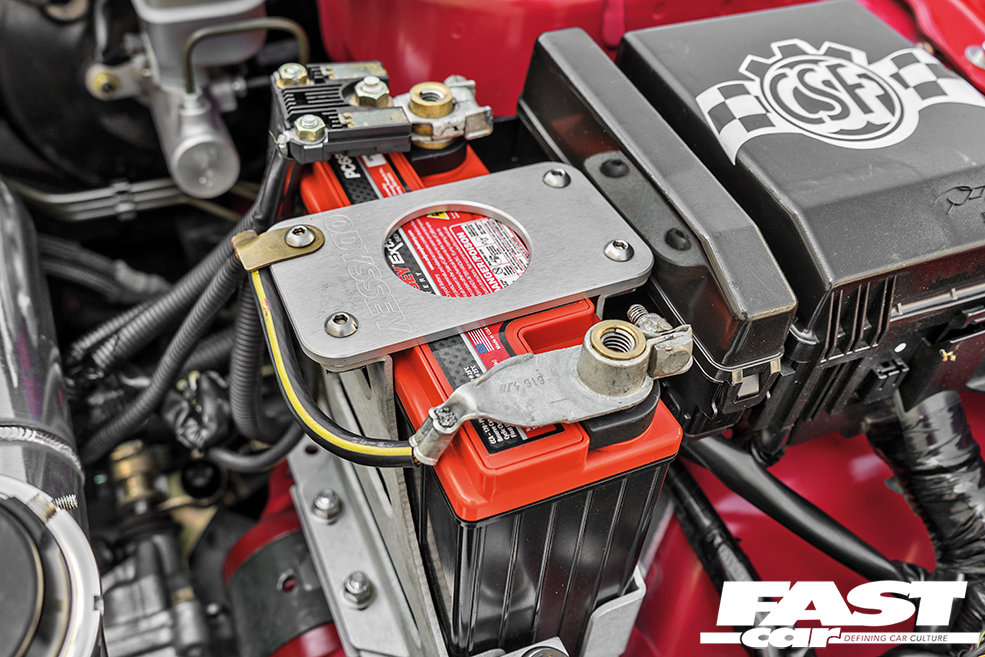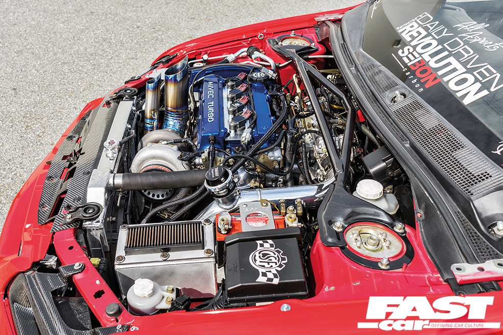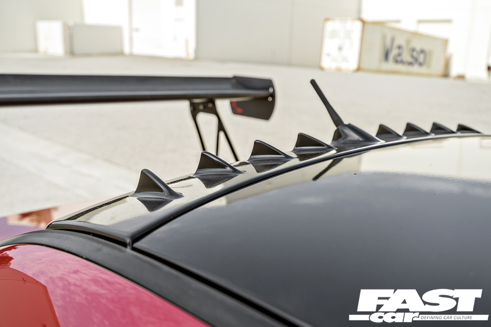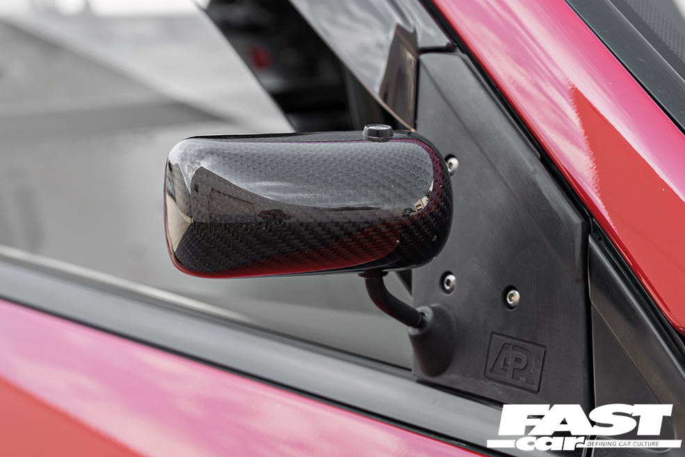 The body has also been gradually evolving in line with the mechanicals. When Sergio swapped to the all-carbon front end he sold off all the original bodywork that had been unbolted, but in order to keep the look fresh he decided to acquire and swap back in an OEM front bumper, complemented by a JDM-spec rear item, and you can’t miss the huge Kognition wing – in combination with the Varis diffuser and Voltex vortex generators it really does make the back end look pert and purposeful. The front wings are now Chargespeed carbon pieces, joining the Seibon carbon bonnet and Rexpeed carbon skirts in a carnival of black-weave cheer, and the paint’s been carefully colour-matched to the OEM Phoenix Red. Because while bare carbon is cool, lightly painted carbon has more of an F40 vibe.