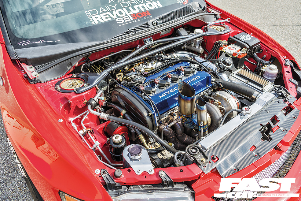 4G63 2.0-litre, Precision 6266 Gen 2 BB turbo, Turbosmart wastegate, blow-off valve, Sheepey Built forward-facing turbo manifold, Turbo-Guard screen filter, titanium bonnet-exit exhaust, bonnet-exit wastegate pipes, FIC 1,800cc injectors, E85 tune by KT Motoring, GSC S3 billet cams, AEM cam gear, Crower springs and titanium retainers, custom titanium cam cover, Zaklee Corp clear vernier cover, Gingeneering billet engine mounts, oil catch can, front-mount intercooler, titanium intercooler piping, Vibrant Performance HD hose clamps, Magnus intake manifold, Skunk2 throttle body, Radium fuel rail, CSF radiator, Odyssey race battery, Chasing Js titanium cooling plate, SpoolinUp coil packs, Ebb Fab titanium upper radiator pipe, power steering reservoir, radiator reservoir, coil pack plate and cam sensor heat shield, Dress Up Bolts titanium hardware, Competition Stage 4 clutch, 518whp