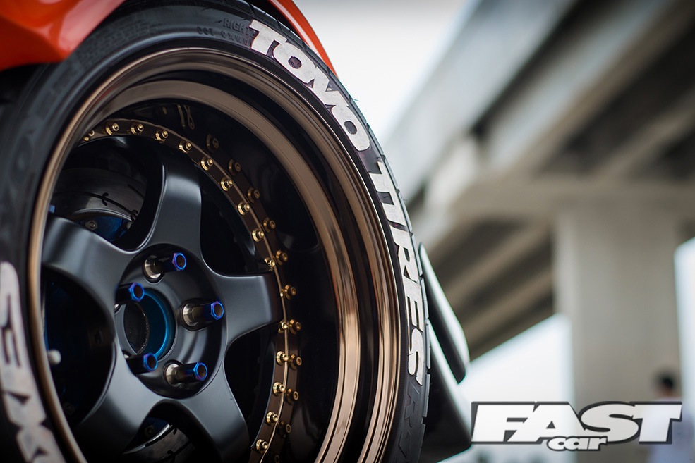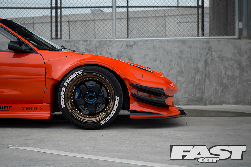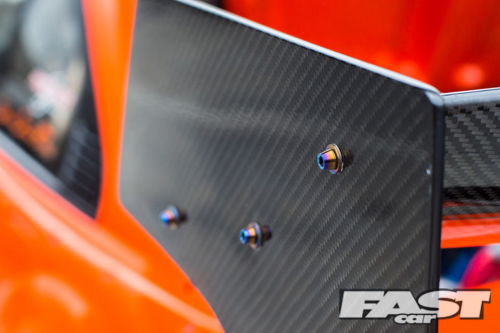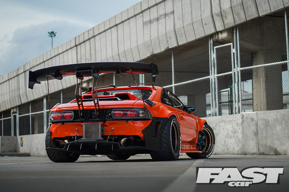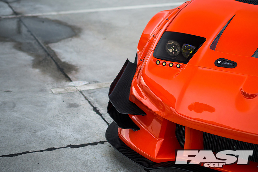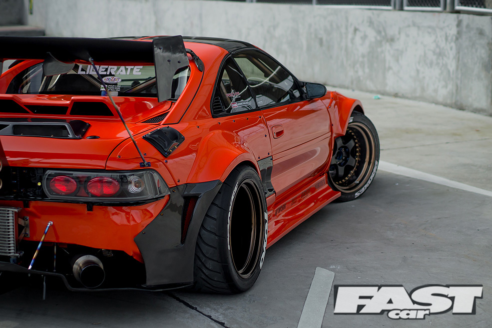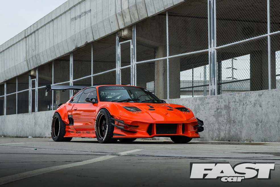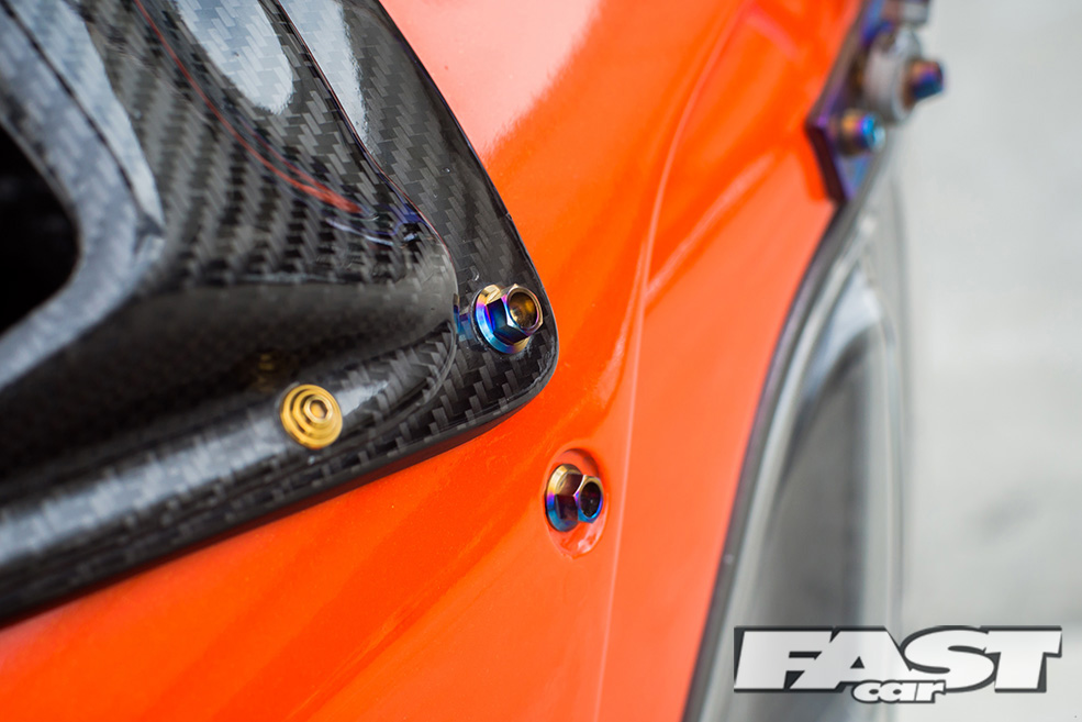 Muk delight orange respray; Garage Unique Street Warrior wide bodykit; Garage Unique 180cm GT wing; Border bonnet; Bomex engine cover; POON headlights; Ganador side mirrors; Mazterpiece Automotive titanium fasteners and bolts.