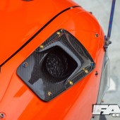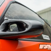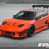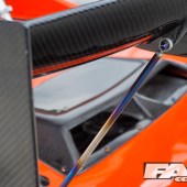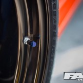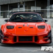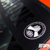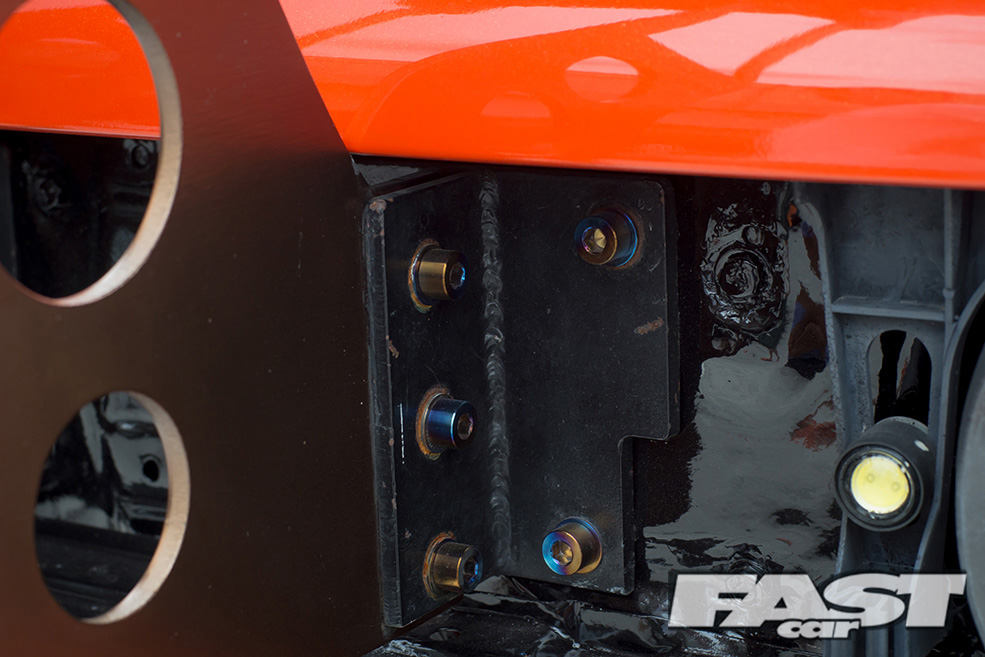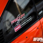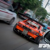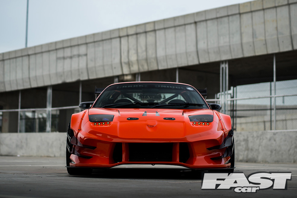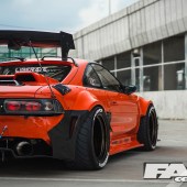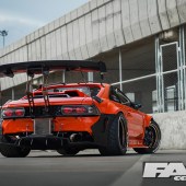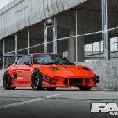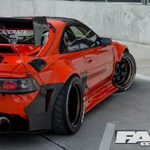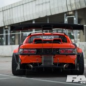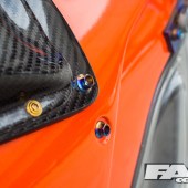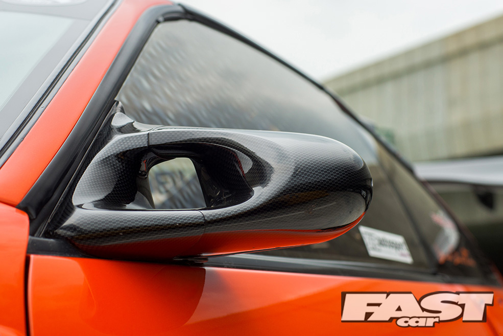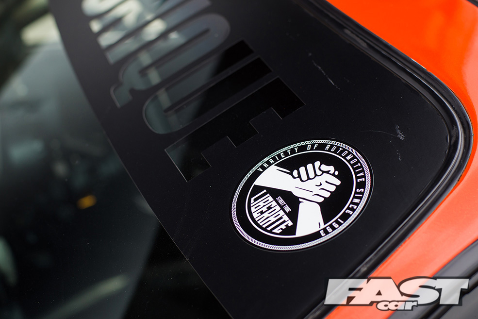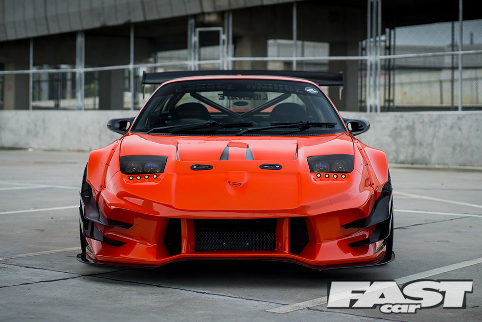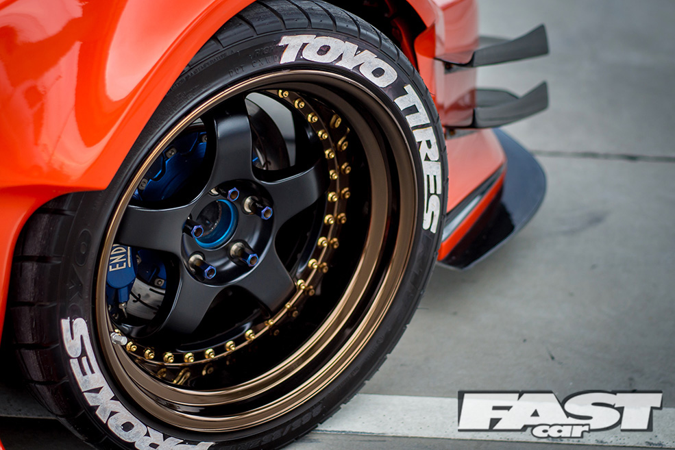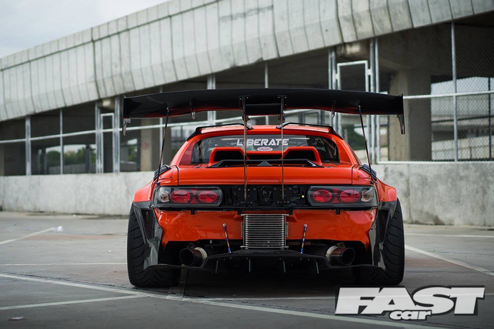 Muk delight orange respray; Garage Unique Street Warrior wide bodykit; Garage Unique 180cm GT wing; Border bonnet; Bomex engine cover; POON headlights; Ganador side mirrors; Mazterpiece Automotive titanium fasteners and bolts.