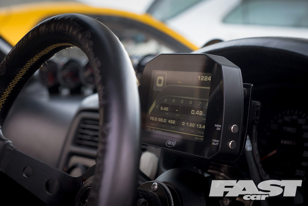 A look inside reveals a host of Defi gauges. That styling of multiple gauges is hugely popular in Thailand, however Momm is looking at replacing them with GReddy’s new lineup. The two gauges in the centre dash reveal the air temperatures before entering the intercooler and afterwards. A lot of heat is generated from the turbocharger and making sure sufficient air can reach the intercoolers in the rear is always a challenge for mid-engine vehicles – a problem Momm has experienced in the past. Thus he is always paying attention to those two gauges making sure the air temperature after the intercooler is below 50°C. Wanting for a more reliable read out, Momm has installed an AIM MXS Strada Dash.