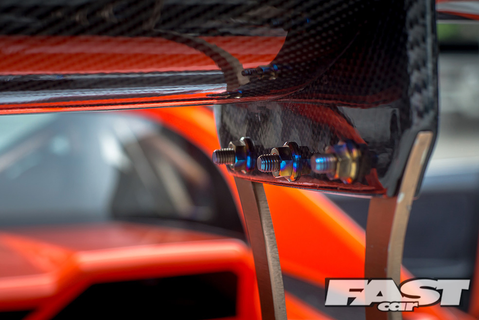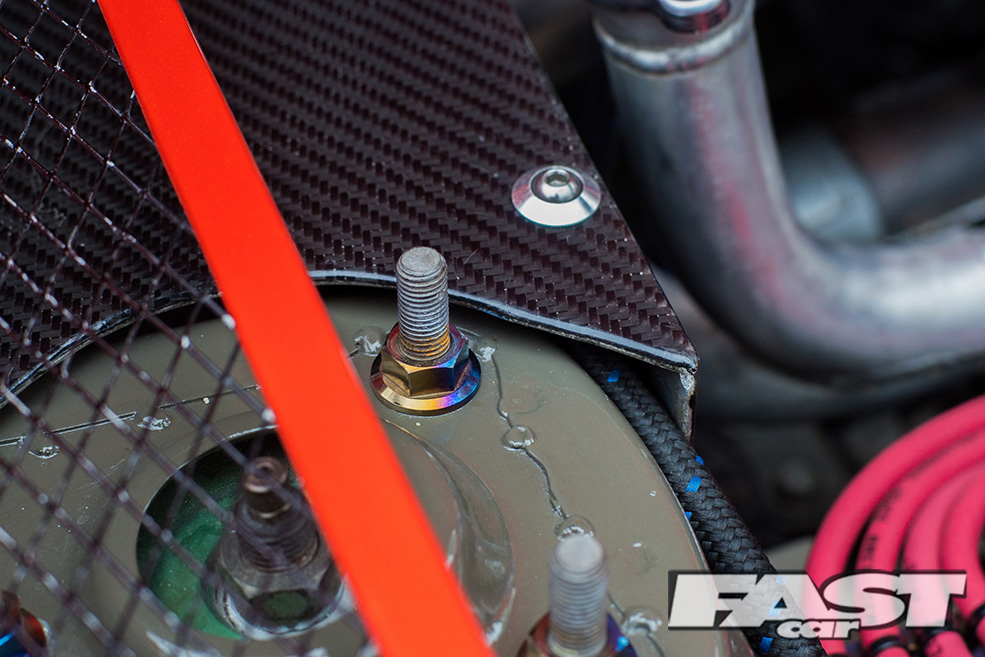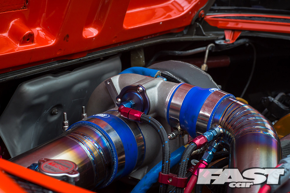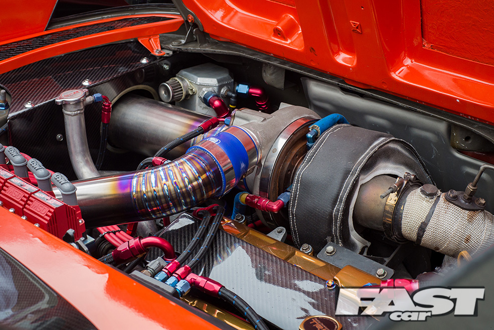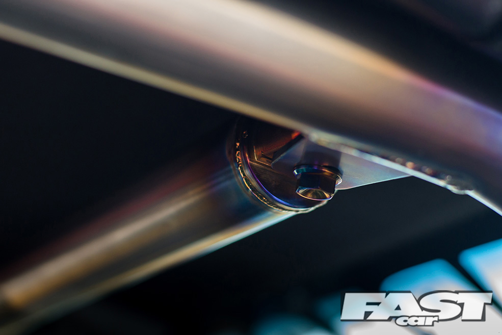 A peak under the hood instantly reveals more titanium, and a huge BorgWarner EFR 8374 turbocharger system that hides the 3SGTE inline four. The 3SGTE has been worked over and now has Eagle connecting rods, Arias pistons, HKS camshaft, larger valve springs and retainers. And APR rods and head studs to make sure it’s all sealed and can handle the 1.7 bar of boost.