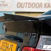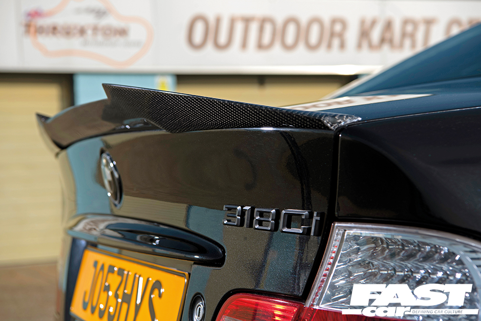 Black grilles, CSL lip moulded to front bumper, side blades, carbon mirror caps, rear diffuser and M4-style rear spoiler, carbon roundels, black 318Ci badge