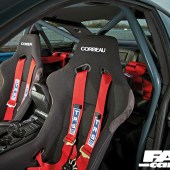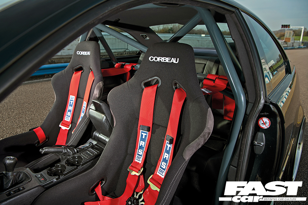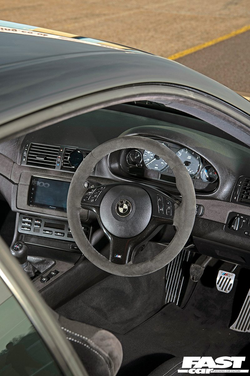 Corbeau Club Sport seats, TRS four-point harnesses, roll-cage, Coolerworx shifter and RPM England shifter surround (fitted after shoot), Alcantara dash panels and door armrests, Alcantara steering wheel with carbon roundel, alloy pedals, Pioneer double-DIN head unit, vent-mounted boost gauge