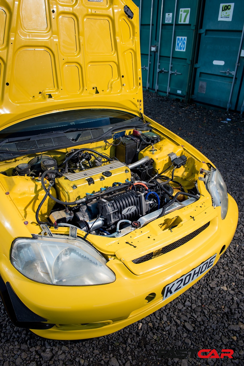 ENGINE: 2.0-litre, 4-cyl, 16v K20A2 VTEC engine, Jackson Racing M62 Roots-style supercharger, 8psi pulley, Walbro 255lph fuel pump, Hybrid Racing fuel rail, RC Engineering 650cc fuel injectors, braided fuel lines, Cosworth spark plugs, Cosworth race-spec thermostat, Mishimoto radiator, Vibrant air filter with custom aluminium 4in pipework, 70mm Hybrid Racing throttle body, Toda tubular exhaust manifold with 3in collector, 3in custom exhaust system with Magnaflow centre pipe and Turn 12 back box with turned-down tip, Hasport EKK2 engine mount kit, Hondata KPro 4 ECU with custom TTS Performance map