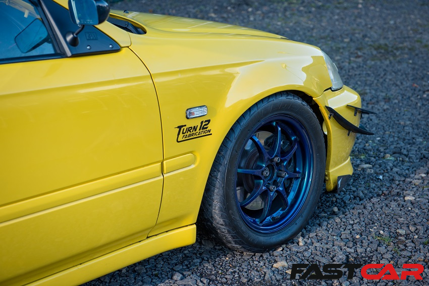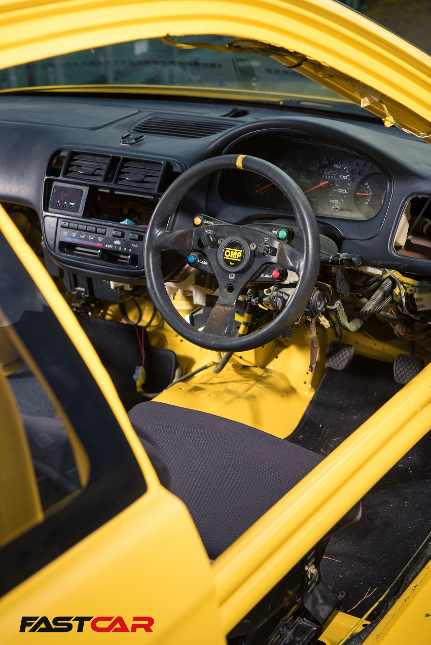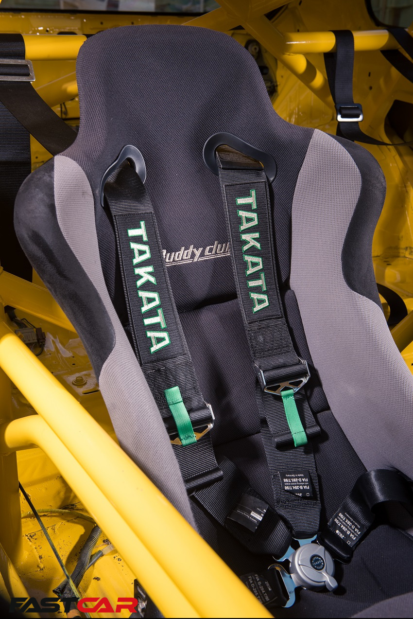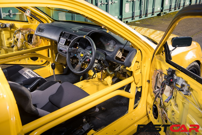 With panels replaced and a sumptuous full respray inside and out, performed in that iconic yellow hue from the guys at Northamptonshire-based Paint-Tec, Jordan took the opportunity of the car being stripped back to a shell to add the likes of polycarbonate windows, some subtle aero upgrades and those lightweight APR racing wing mirrors, perfectly signifying that some more substantial changes were about to take place…