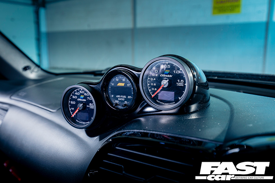 Sparco Pro Race 2000 seats, Buddy Club seat rails, Sparco 330mm suede steering wheel, custom piano black trim, custom suede doorcards and centre armrest, Tegiwa triple gauge pod, AEM AFR gauge, GReddy boost gauge, GReddy oil pressure gauge, Qube engineering custom white LED cluster, rear speakers removed, soft top and motors removed