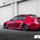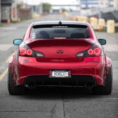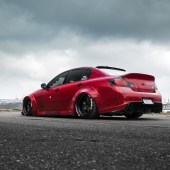 Full re-spray in custom BASF/R-M Carizzma Candy Ruby Red Metallic; Glasurit Superior Gloss clear coat; CQuartz professional nano-ceramic coating; full Liberty Walk wide-body kit (modified and adapted from G37 coupé application); Nissan GT-R bonnet vents; modified Infiniti Sport-spec chin spoiler lip; Carbon Signal Spec IN front splitter, V1 side skirts and rear diffuser; Custom Successful Automotive Bella ducktail rear spoiler and side skirt extensions; Access Evolution wing mirrors; ShadowSpeed rear windscreen spoiler; custom OnEighty satin black headlight housings with quad LED halo bulbs and custom quad RGB demon eyes; JDM LED indicator covers; factory LED daytime running lights; custom Ghozt Lighting rear indicator and brake light modules; custom TRS projector LED fog lights; LEDGlow under-car lighting.