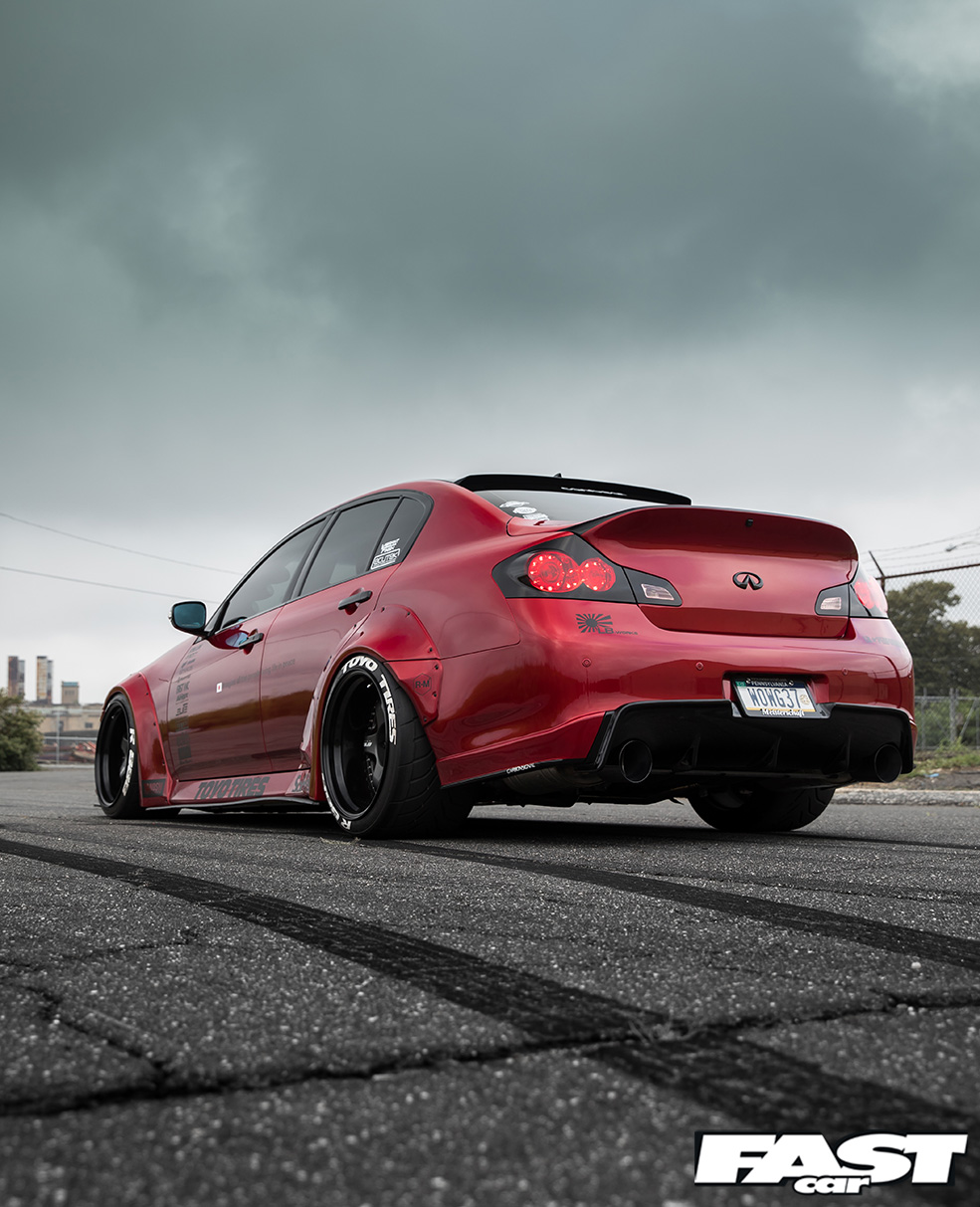Although he’d spotted countless two-door coupé examples of the G37 receiving a whole load of attention at shows like SEMA in Vegas in recent years, Drew was hard-pressed to find anyone that’d shown the four-door saloon version like his any love in the modified car scene, helping to spawn his plans to do things a little differently from here on out. “I wanted my saloon to be one-of-a-kind; many coupés could pull off what I was planning, but it’d never been done with a version like mine before…”