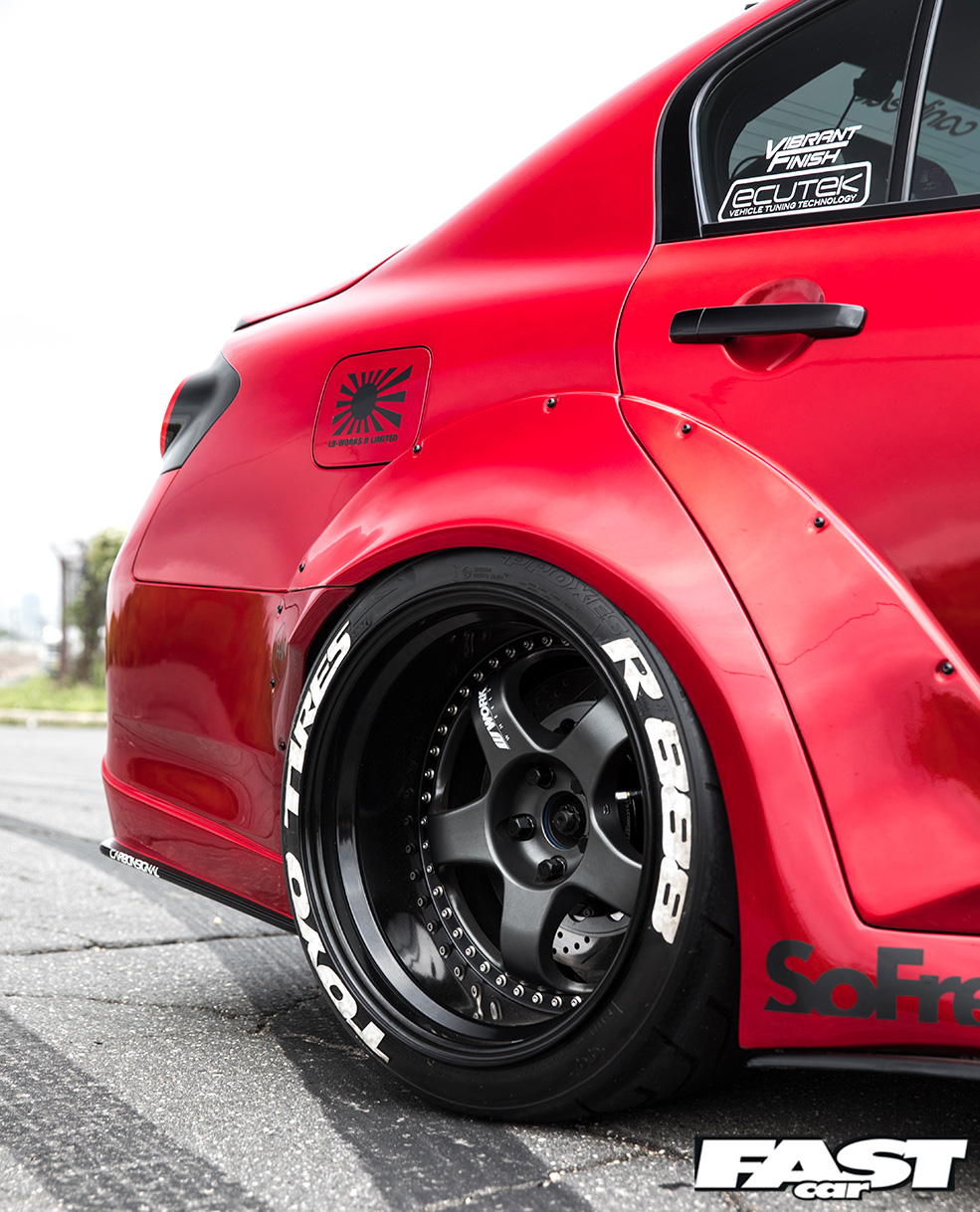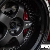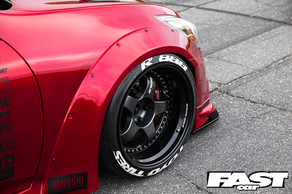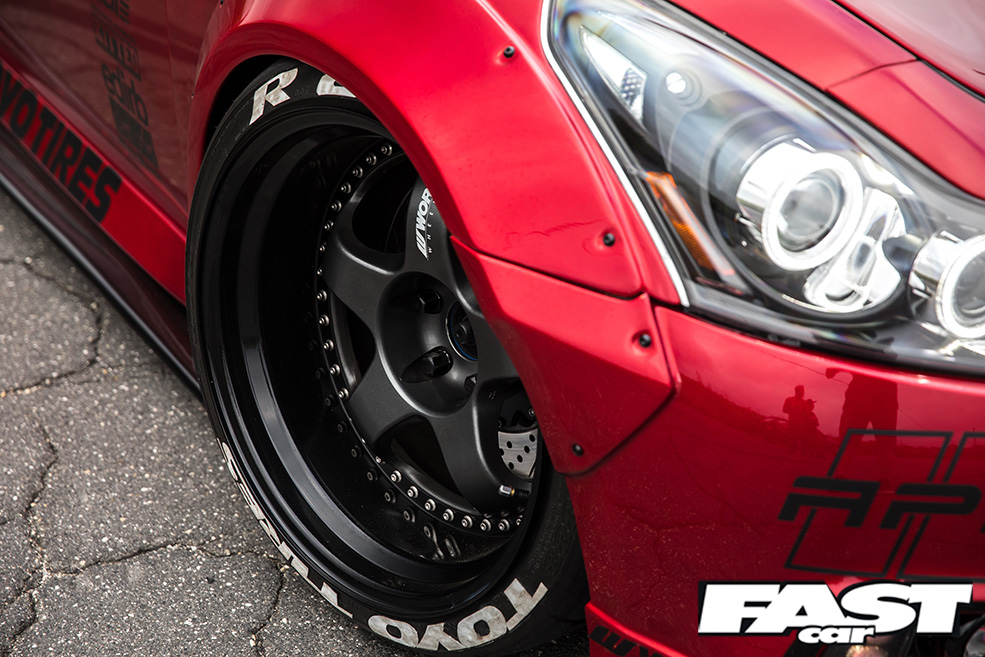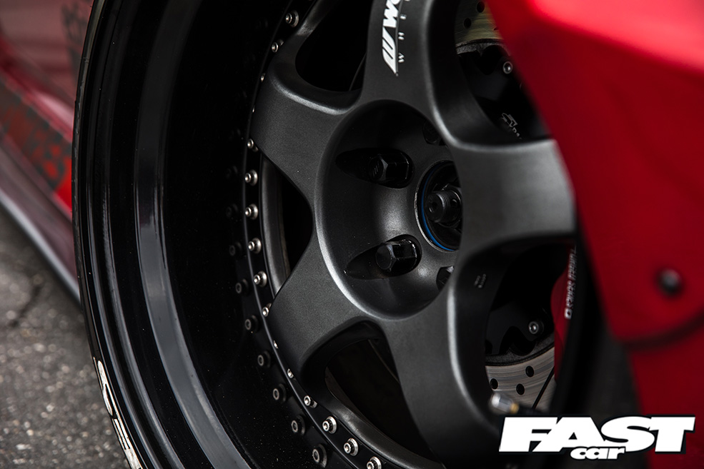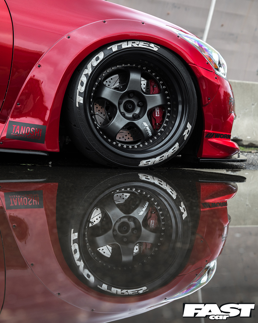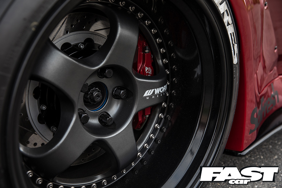 12.5x19in (front) and 14.5x19in (rear) custom WORK Meister S1 three-piece split rims in gloss black with matte graphite faces; polished WORK wheel hardware; 295/30/19 (front) and 325/30/19 (rear) Toyo Proxes R888 semi-slick tyres; AirREX digital air suspension system with pillowball mounts; SPC camber arms (front and rear); Cusco sway bars; GTSpec front strut tower bar; front strut tower modification for extra clearance; R1 Concepts body-matched forged six-pot (front) and four-pot (rear) brake calipers; cross-drilled and diamond-slotted high carbon alloy two piece brake discs (all round); R1 Concepts brake pads; stainless steel braided brake lines.