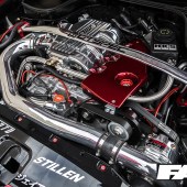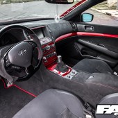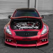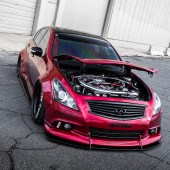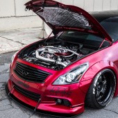 3.7-litre VQ37VHR V6 engine; Vortech V-3 supercharger kit by Stillen/RTTuning; Turbosmart blow-off valve; Frozenboost water-to-air intercooler; HKS M45HL Super Fire racing spark plugs; Fast Intentions resonated high-flow cats; GThaus MeisterSchaft cat-back exhaust system with custom 130mm exhaust tips; gloss black engine bay with fully polished hardware and bolts; HKS limited-edition caps; custom LEDGlow engine bay LED strobe lighting; Stillen grounding kit; EcuTek ECU.