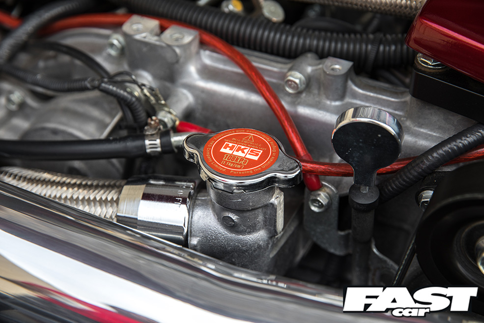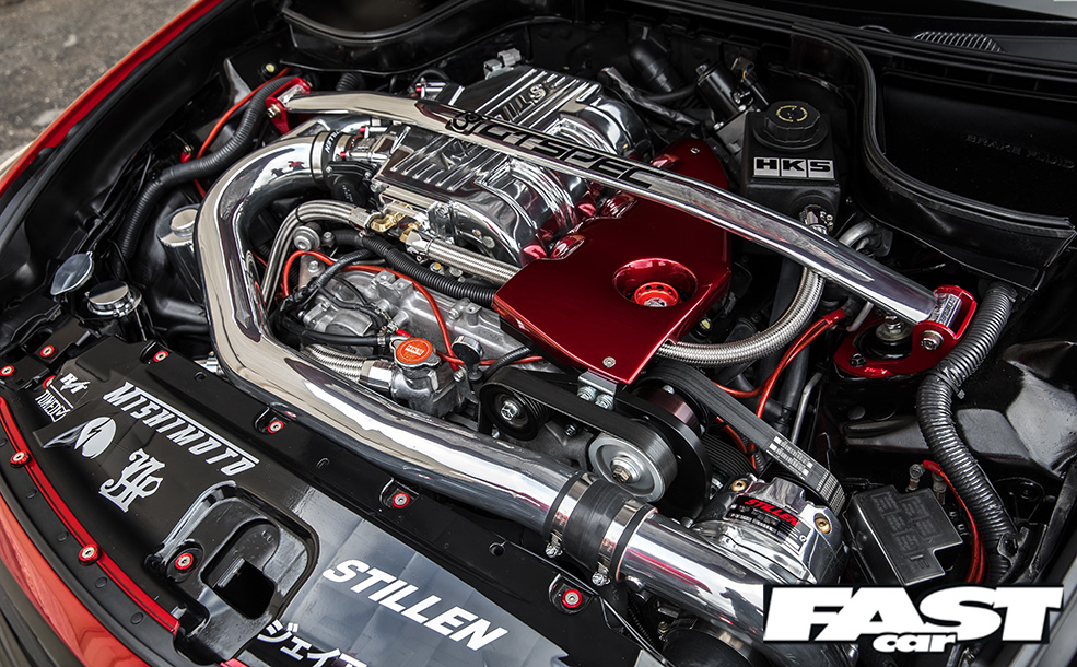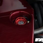 Thankfully, though, the kit was soon sitting perfectly and was topped off with some subtle extras such as bonnet vents from a GT-R, Carbon Signal splitters and that custom ducktail spoiler, before the next rather unforgettable enhancement was performed: that blazing Candy Apple Red paint job. Another one-off, the colour was developed with help from BASF and is topped off with a Glasurit clear coat and CQuartz ceramic coating to make sure it’s smoother than Marvin Gaye’s greatest hits album. “It looks ridiculous when it’s out in the sun now!” our proud owner gleams.
