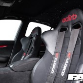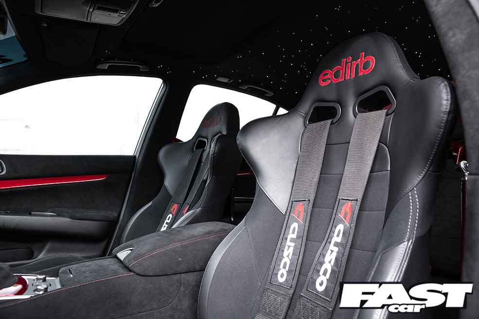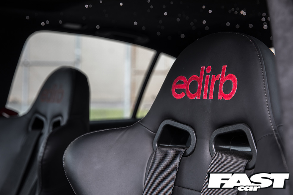Bride ‘edirb’-series premium reclining leather front bucket seats with matching rear bench; Cusco harnesses; body-coloured NRG Innovations harness bar; ExactArt Fabrications custom Alcantara headlining with illuminated star lighting; body-coloured interior panels; Tommykaira LE gear knob; modified factory steering wheel with carbon fibre elements; Tanabe Revel VLS 52mm A-pillar gauges (boost, air/fuel ratio and oil pressure); custom AWD/RWD and VDC on/off toggle switches; custom ICE/air boot installs with LED lighting and illuminated Liberty Walk-style flares; Bose 10-speaker audio system; twin 12in Alpine Type-R sub woofers; Hifonics Brutus 1500w Monoblock Series amplifier; twin Shuriken 600w reserve batteries.