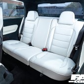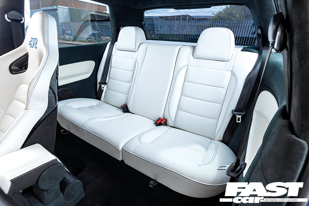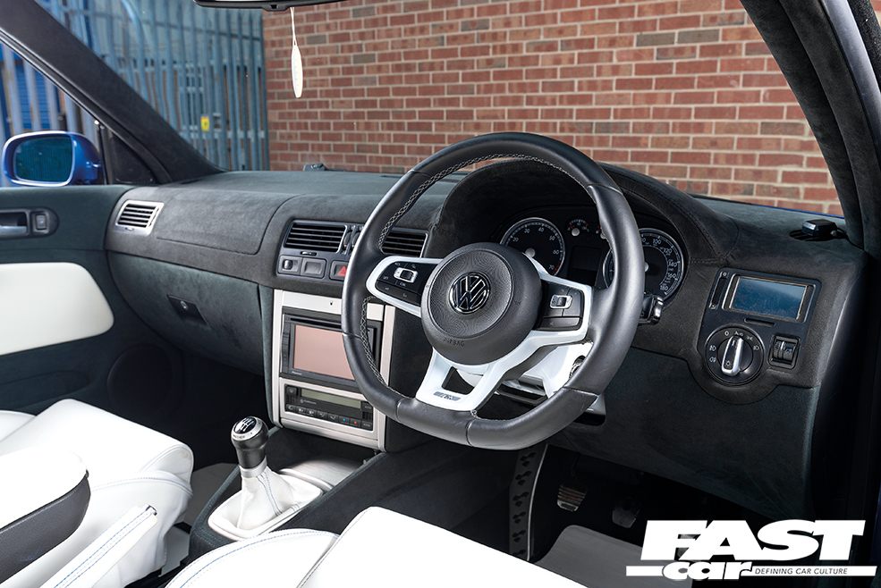 Mk5 R32 wingback front seats with custom subframes, rear seats bolstered to mimic Mk5 R32 bench, Mk5 R32 rear headrests, Passat armrest, full white leather retrim (seats, door card centres, gaiters, parcel shelf, boot floor, armrest, mats), contrasting black Alcantara trim on dash, door cards, headlining, A, B, and C pillars and boot surround, Mk4 Golf Anniversary interior trim, custom display in air vent, Mk7 Golf R steering wheel with white trim, Pioneer double-DIN head unit, Alpine 4-channel amp, Alpine monoblock amp, Alpine low-profile 12” sub, custom boot build in white leather and Alcantara with colour-coded air tank