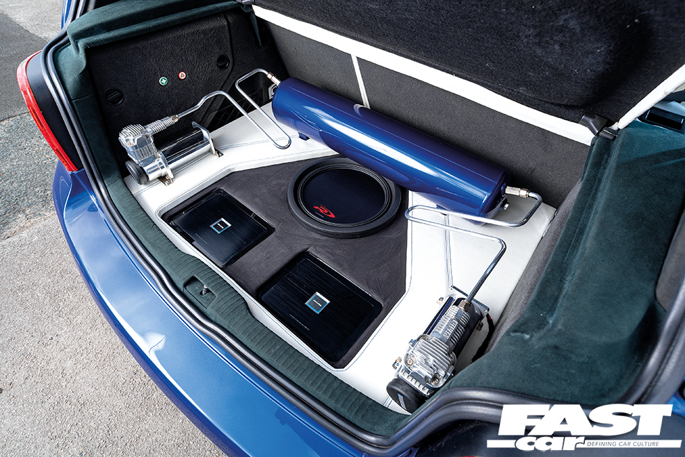 Things were really starting to snowball by this point, with the to-do list getting longer and longer. Since there was new air-ride hardware to accommodate, Paul planned out and crafted a custom boot build to match the retrimmed interior, complete with colour-coded air tank, before turning his attention to the exterior. The taillights were exchanged from UK-spec to Euro items, simply because they’re a bit different (a nice little easter egg for the aficionados to spot), while elsewhere the Golf received new TRC splitters fore and aft, and OEM mirrors on carbon-dipped bases to replace the Lupo mirrors that had been fitted.