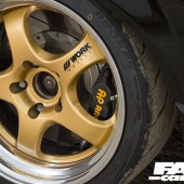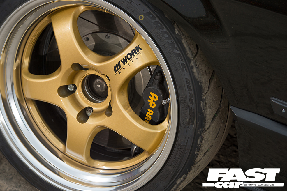 WORK Meister S1 wheels (front) 8.5×17 ET15 R-disc, (rear) 9×17 ET15 O disc, 205/40×17 Toyo R888R semi-slick tyres front and rear.