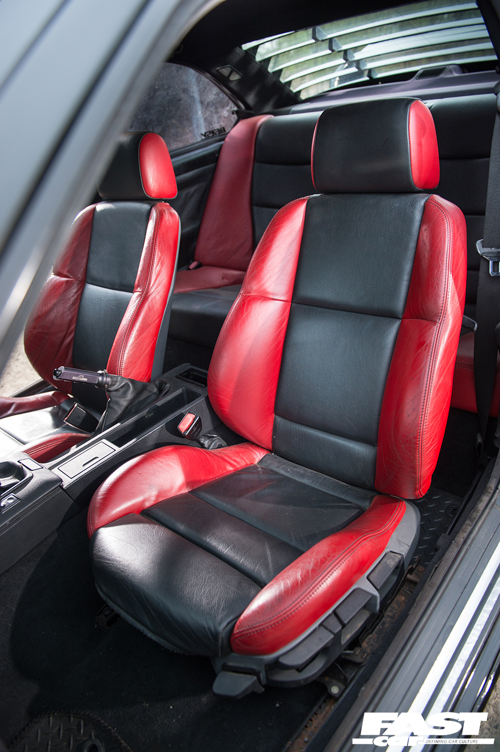 Full black and red leather interior, black roof lining, AC Schnitzer handbrake lever; volt, boost, and water temp gauges, fuel cut-off switch, E46 M-Sport steering wheel.