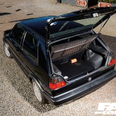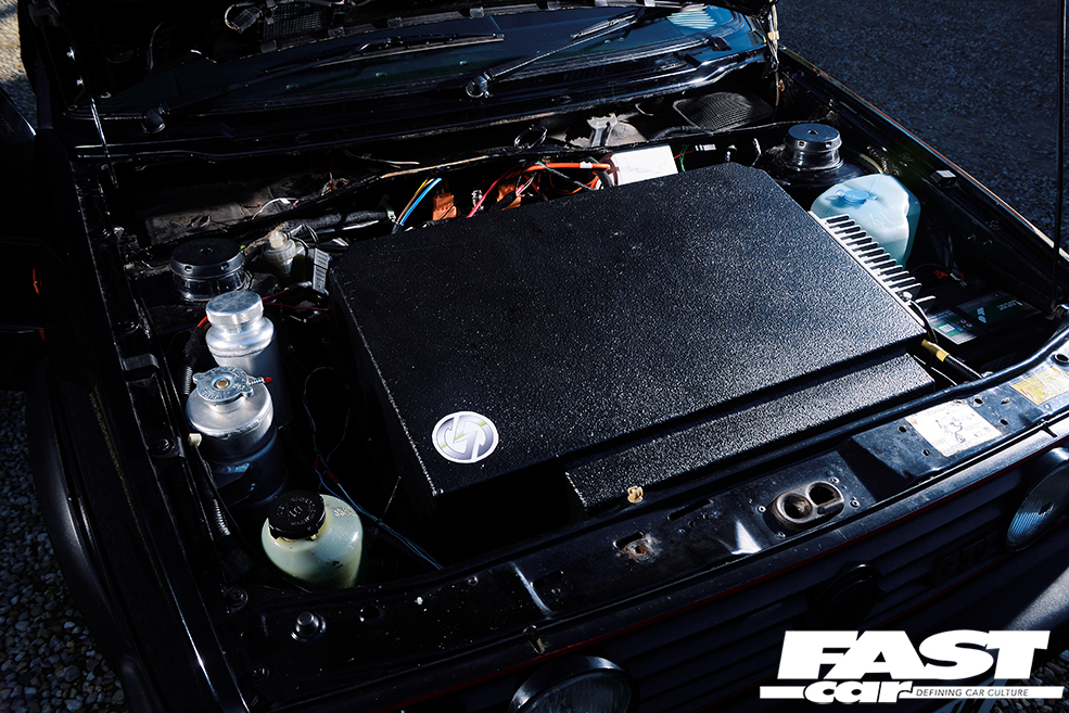 The conversion process for a Tesla-swapped Mk2 Golf doesn’t end there as the engine bay also houses a custom control box to pick up on the 12v circuitry and safety control of all other aspects of the vehicle with relays and protection fuses. The power steering is now driven from an electric pump as is the brake servo system. Intricate cooling systems for the drive unit and batteries are then installed, also located within the engine bay. Incredibly, this clever use of hidden fabrication work and available space means the Golf still has a usable boot while outwardly it remains standard, it’s amazing how much you can fit in a Mk2!