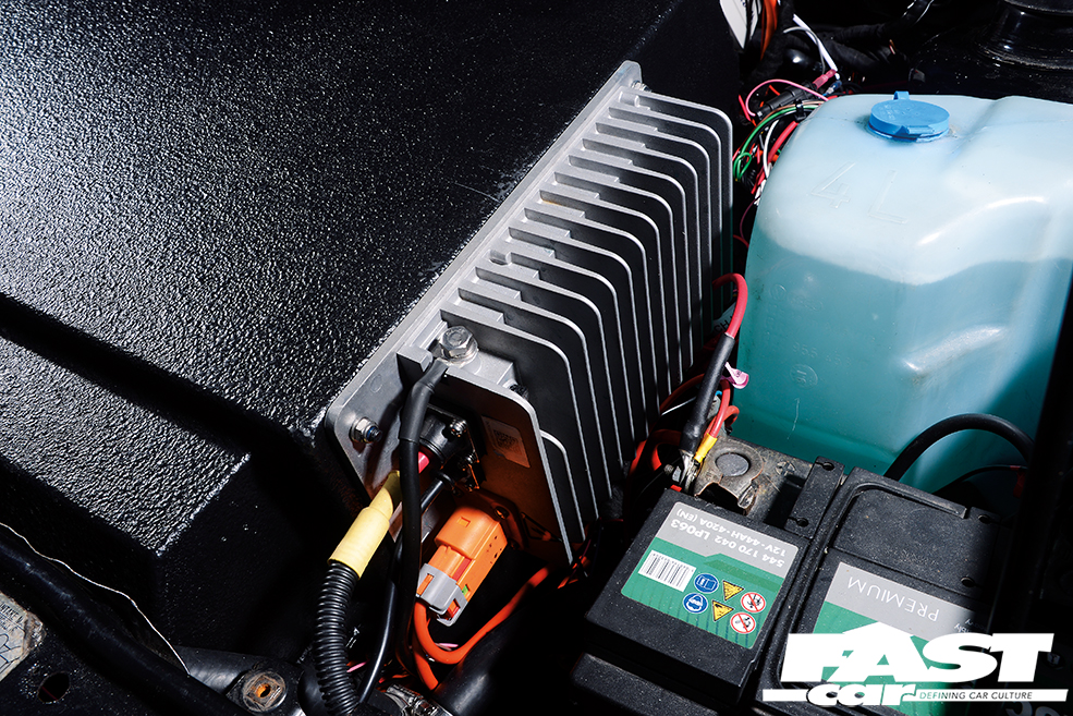 The next step involves 3D scanning the entire vehicle to work out where the battery packs will be housed and as we all know, these often take up plenty of space! “We not only have to think about where the packs will fit, but also how they will be assembled,” Kit continues, “we prefer to assemble as much of the high voltage pack as possible on the bench to ensure the system is connected safely, ready for it to be lowered into position in the vehicle.” eDub Services use brand new CALB batteries as they are smaller and easier to package than standard Tesla equivalents, as they’re brand new the new owner can be confident there is plenty of life left in them too. The split battery pack at 350v nominal in this Mk2 is located 50% in the boot complete with its lowered floor while the remainder sits under the bonnet above the drive unit. “Once the battery locations are finalised, we then choose locations for other bulky items such as the charger, the DCDC and any heater integration,” Kit adds