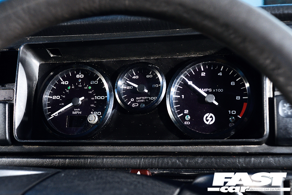Dash-mounted start and heater switch, custom dials showing MPH/ battery state of charge (SOC), amp gauge, motor temperature dial in gearstick location, drive/neutral and reverse gears, floor mounted electric throttle pedal
