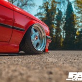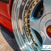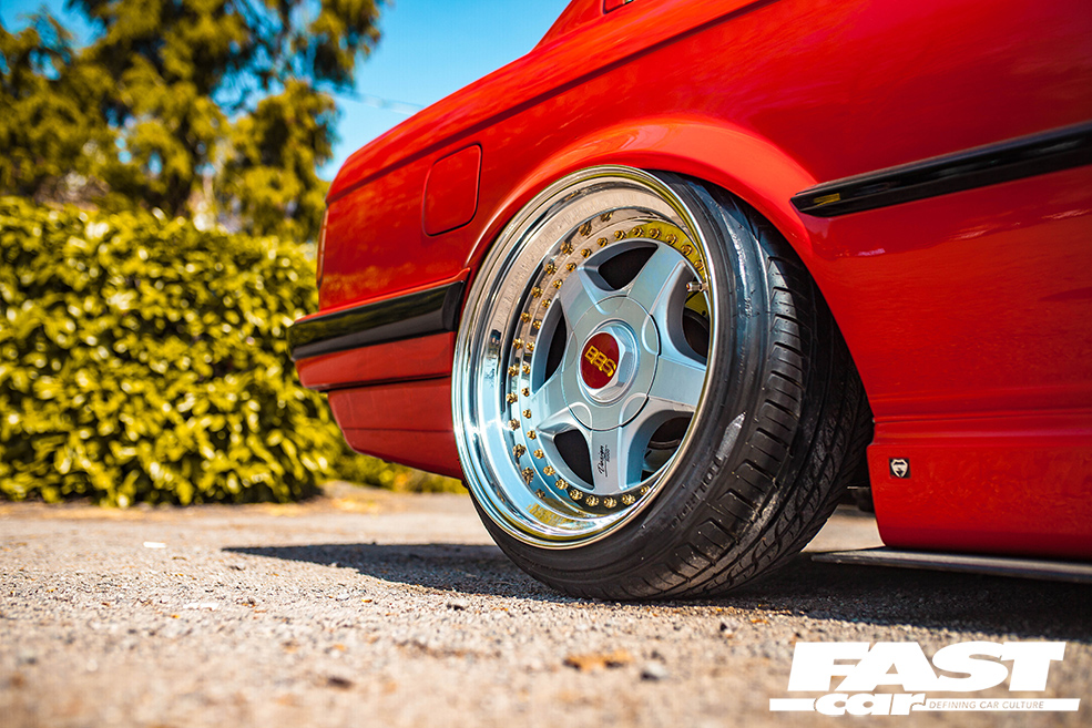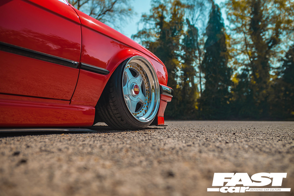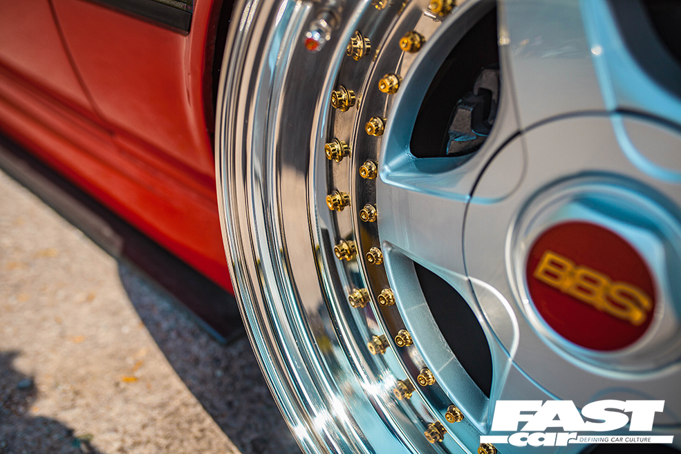 9.5x17in (front) and 10x17in (rear) BBS RF 3-piece split rims – with 3in dish Radinox lips, gold hardware and red centre caps, 195/40 tyres, Air Lift Performance struts and bags all round, 3P management (all controlled by smartphone), 3/8 lines, 444c compressor, custom top mounts, fully polybushed, new rear subframe, rear disc conversion