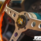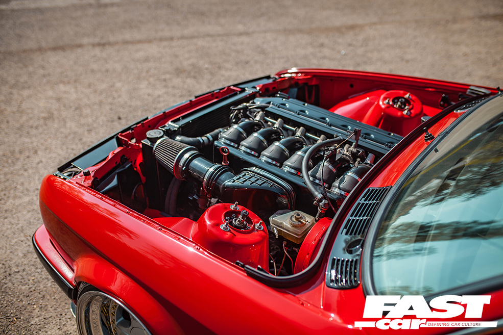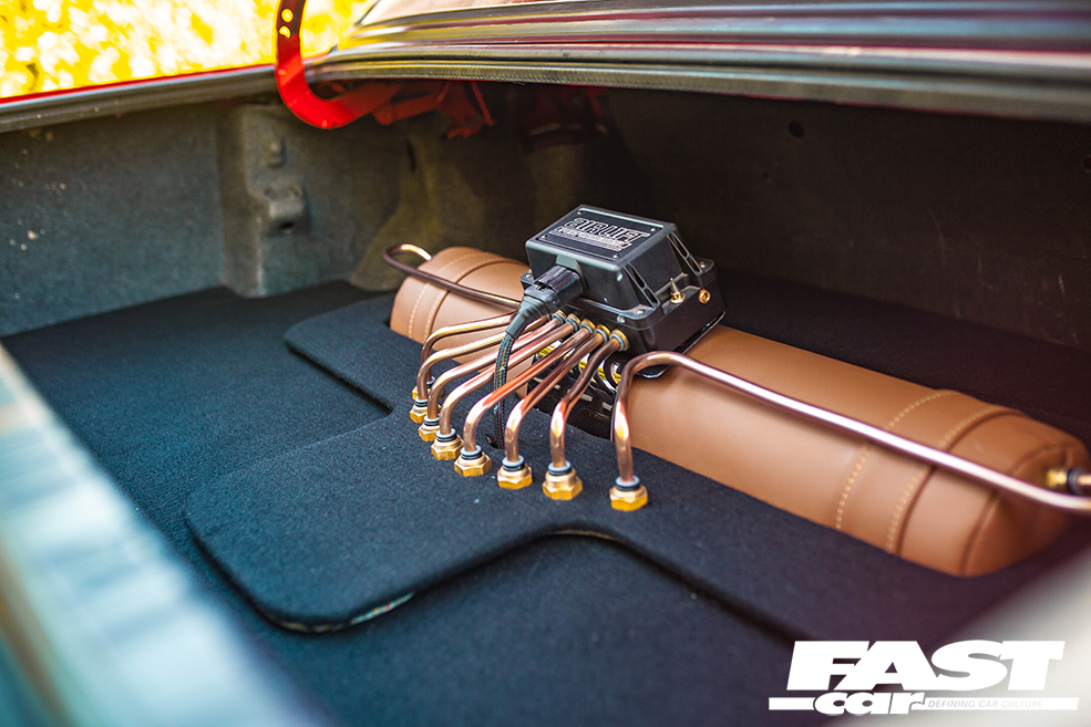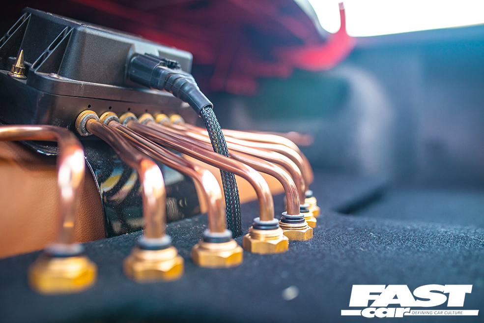 That air install is particularly cool – just look at how the eight air lines spread out from the valve block like a cartoon octopus over the leather-trimmed air tank. Indeed, the whole interior’s been trimmed in sumptuous tan leather; the only part of the build not carried out by Reece’s busy fingers. “Aside from the retrim, I’ve done everything on the car,” he proudly states, and the amount of work that’s gone into the body is just as impressive as what he’s been up to under the bonnet. The eagle-eyed may spot that all four arches have been subtly widened to happily accommodate those staggered BBS RF 3-piece splits, and there’s been a whole world of smoothing before spraying the shell to a flawless finish. The results are sublime, a car that fuses show-winning form with astounding function.