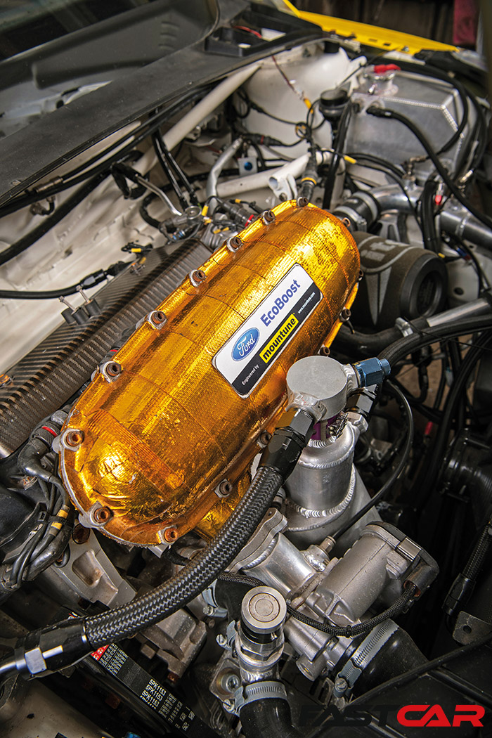 Now, there’s a lot that’s special about this build, but the drivetrain really is something else. “It’s a 2012 ex-WTCC Mountune EcoBoost Global Race Engine,” he explains, “as found in the 2009-2012 era S2000 Arena Touring Cars, which then ended up in the Chinese Touring Car Championship for a bit too. They ran 320bhp with a 33mm turbo restrictor back in the day, with a compression ratio of roughly 12:1. They’re labelled up as EcoBoost, but it’s actually a 1.8 Duratec with a forged crank, rods and pistons, which has been stroked to a 1.6 with a custom direct injection head. We’ve fitted a TOCA turbo from Owen Developments, which in its basic form is a modified GT28; we turned up the boost to 1.45-bar without a restrictor, and on FR102 race fuel it hit 370hp at the hubs, so roughly 400hp at the flywheel.”