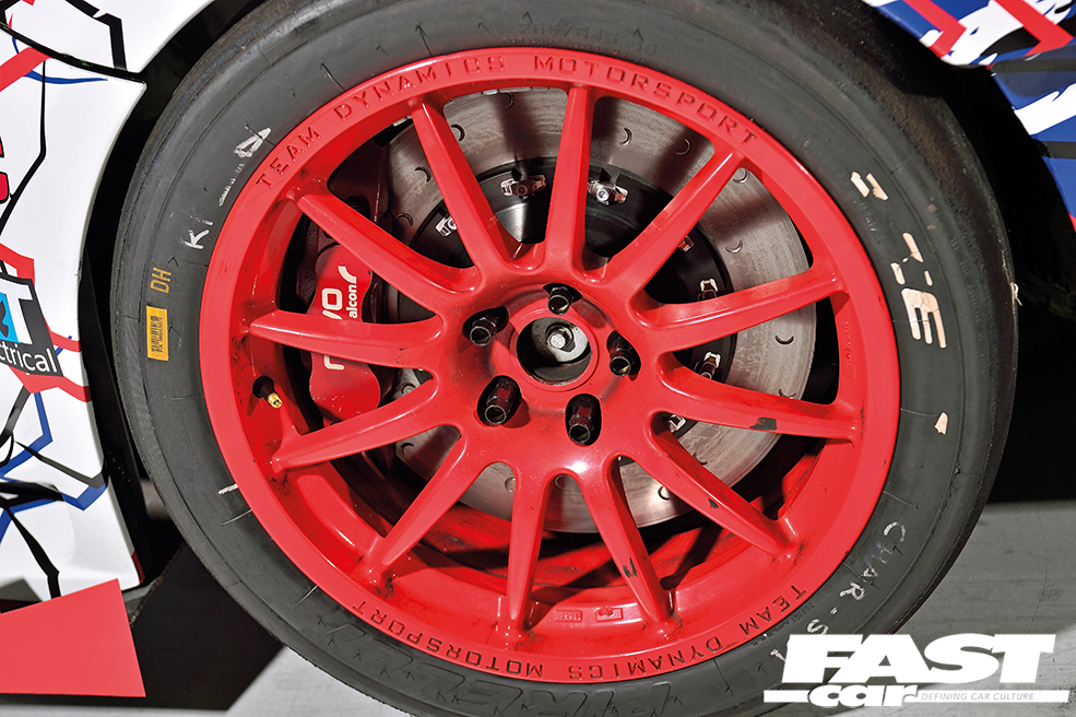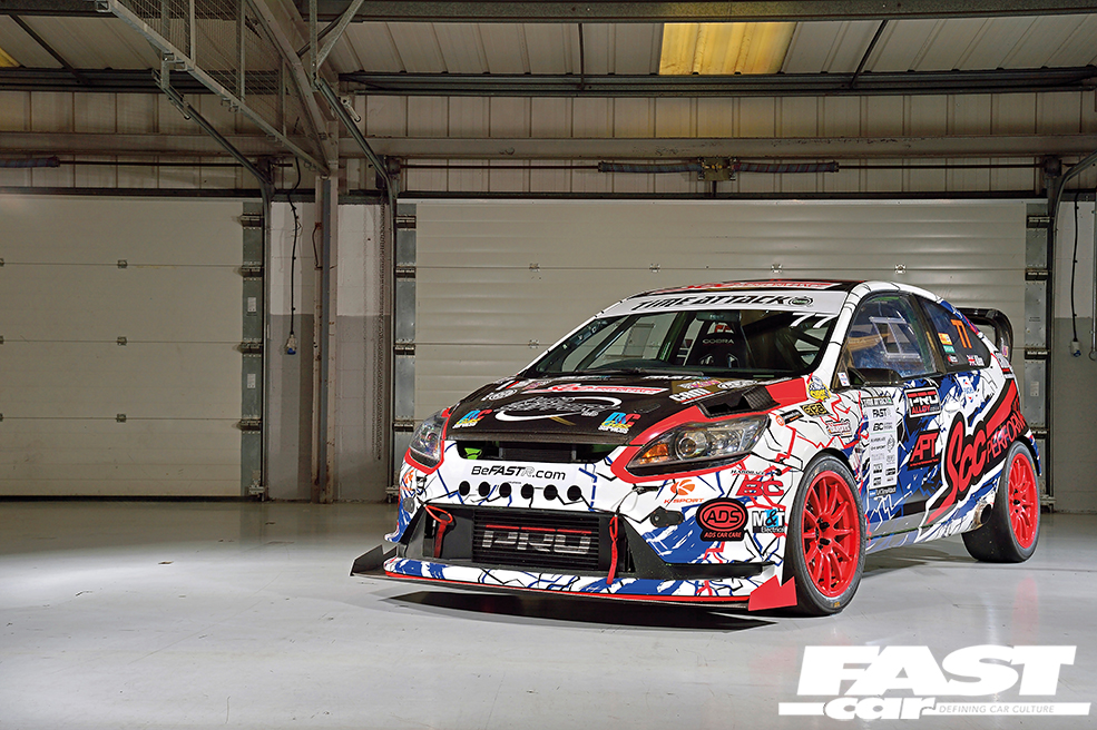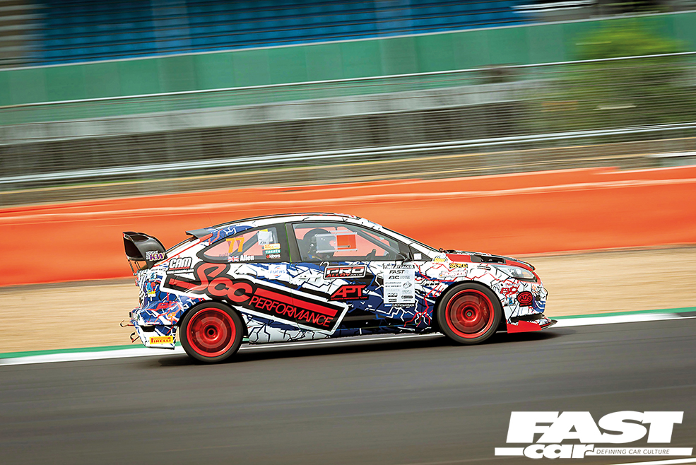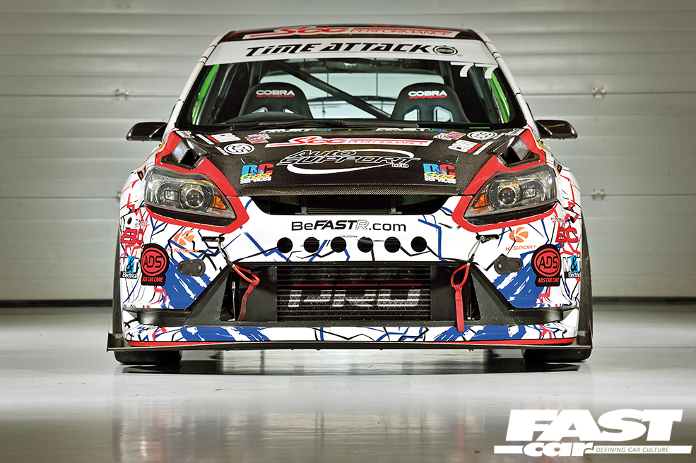 The three most fundamental differences to the car were the change to slick tyres, the Quaife gearbox, and the ECU mapped by Gary at APT. Starting with the latter, the car was always good on the Revo software but there are limits to what it can do, and James remembers the day Gary mapped it on the new ECU. “It came alive,” he smiles, “a massive difference.” The gearbox was a bit of an obsession after seeing the demo unit at Autosport International. “I bugged the Quaife rep for ages who said they needed a distributor, then bugged mountune for ages when they became the distributor – I actually sent 133 emails to the poor guy before he caved in!” he laughs. The effort was worth it though, as the ‘box offers shorter ratios and much quicker changes, in a mostly bolt-in solution. “The car accelerates out of the corners like an animal now,” gushes James, “it really is an amazing enhancement”. The slick tyres are the king of the mods though, as they’ve made the car quicker in braking, around corners, and allow him to get on the power more quickly. “But we’ve had to tweak every aspect of the car around them,” explains James, “we had to play around with the suspension, the arms, the fuel system… the slicks took everything else to its limit”. Luckily, Rob at SCC has been spannering for the BTCC teams over the past few years, so he picked up a few tricks for chassis tweaks along the way. “Rob and I played around with the settings as the car was now rolling and squatting too much with the increased grip from the slicks. We ended up leaving the bump on hard, softening the rebound, and lowering the rear ride height. It worked like a dream!” They also noticed from pictures that the wheels were moving around in the arches under cornering. “ARC made us up some tubular arms – fully rose jointed so taking out any play in the normal bushes. They made a big difference, and also enabled us to dial in more camber than before” says James. He runs 4 degrees negative on the front and 3.8 degrees negative on the rear, toe and castor are set up to the mountune RS500 Focus settings. The final issue caused by the slicks was fuel starvation –enter Pro-Alloy. “Alex and the guys there made the baffled fuel tank, and also all of the intercooler, rad, boost pipes etc,” says James, “everything is an absolute work of art, I almost didn’t want to put it all on the car and get it dirty,” he laughs.