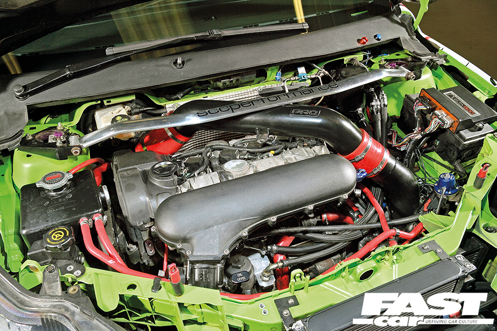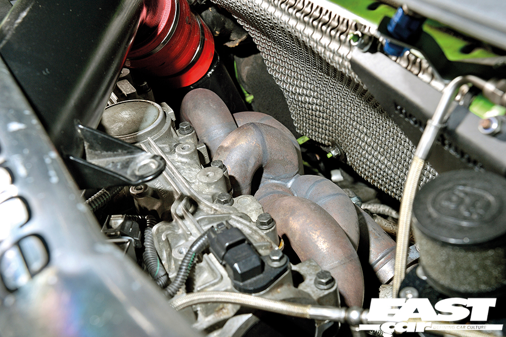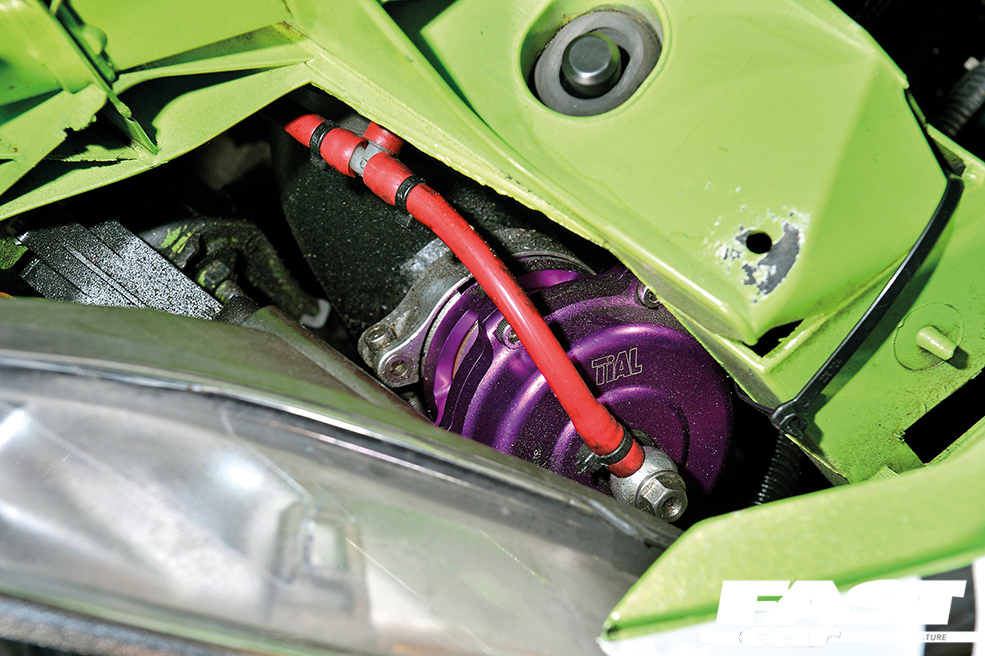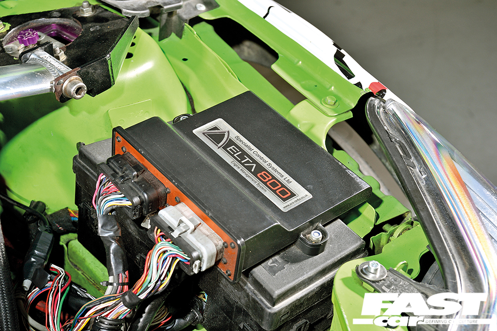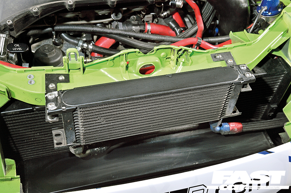 SCS Delta 800 ECU, Bosch 1000cc injectors, custom turbo-back side-exit Milltek exhaust system, Anembo billet inlet manifold, Newman Stage 1 cams, Pro-Alloy breather system, 90mm induction kit, 90mm cross over pipe, header tank, ‘Ultimate’ intercooler, big boost pipe kit, radiator and custom fuel cell, Walbro GST450 fuel pump, modified return fuel rail, Turbosmart FPR1200 fuel pressure regulator, Garrett GTX3076R turbo, SCC tubular exhaust manifold, Tial 44mm wastegate, Tial 50mm BOV, Setrab 405mm 13-row oil cooler, Wiseco pistons, K1 con-rods, 70mm throttle body, block mod, WRT billet crank pulley and WRT air-con delete pulley, potted lower inlet manifold