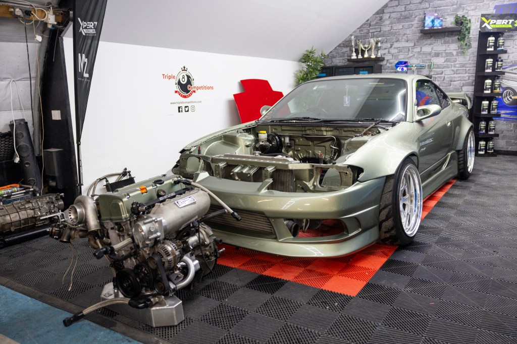 Over in the next bay sits Craig’s uncle David’s K24-swapped S15, and this one sounds like it’s had a proper hard life in the process of becoming what it is now. If you’ve ever heard someone say a K-series conversion is the cheap and easy route, this car would like a word.