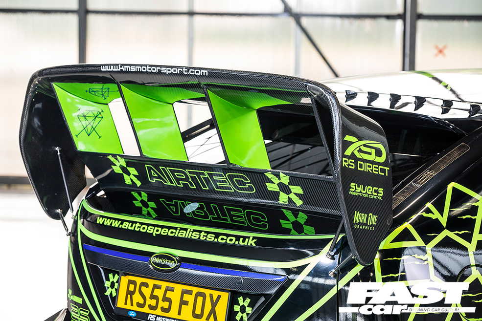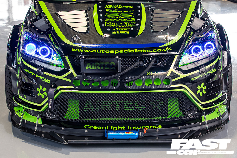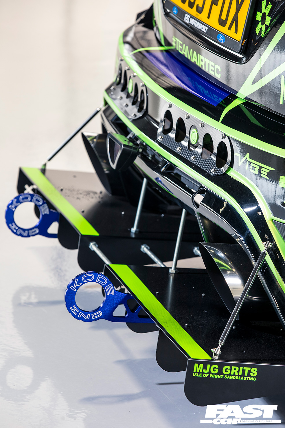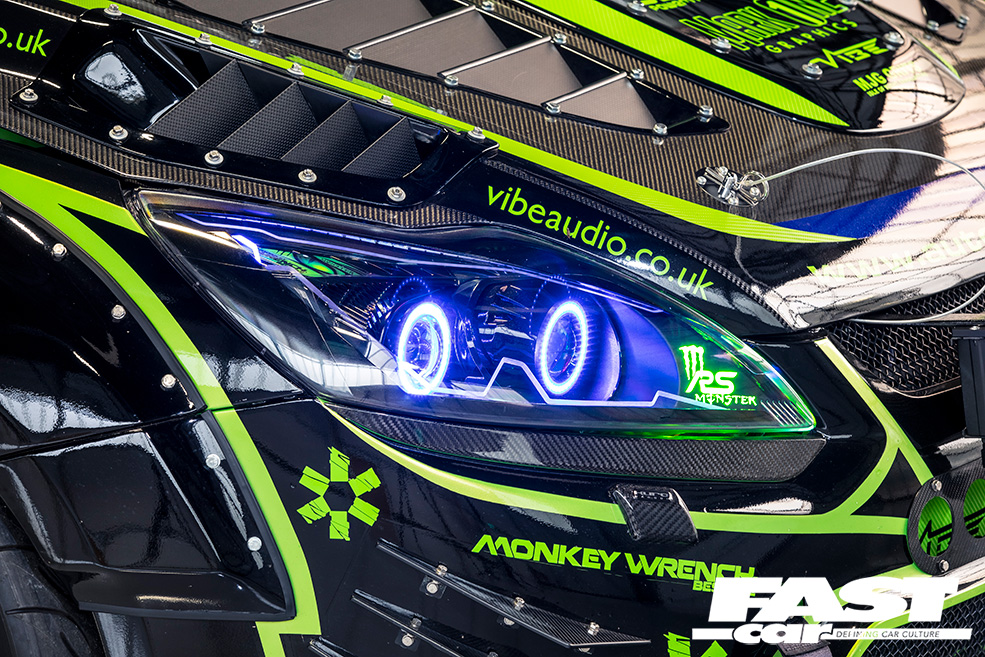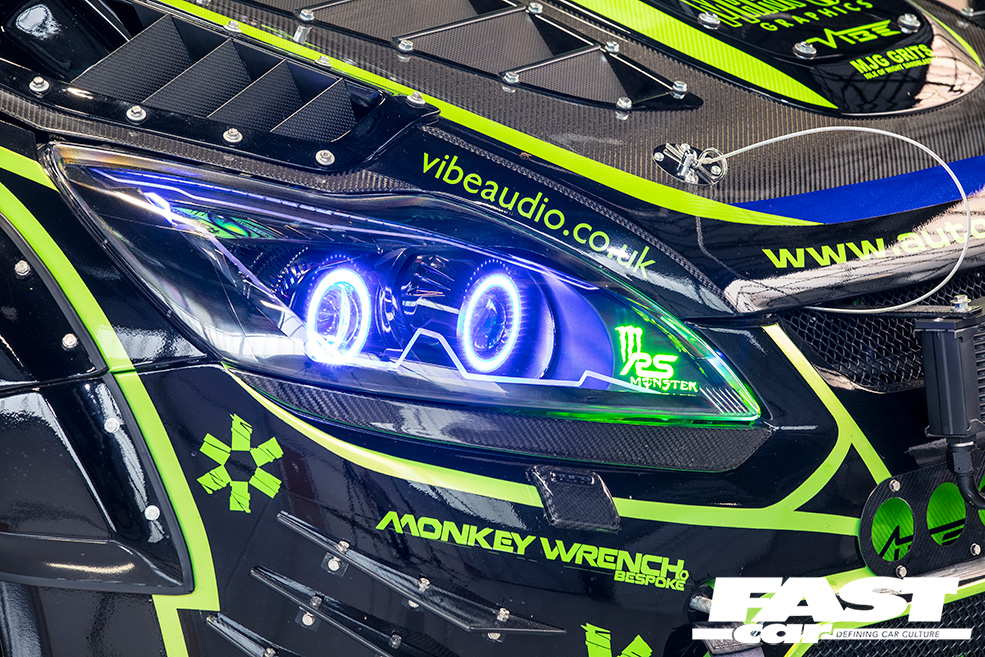ACR Composites WRC front bumper with Zunsport mesh, carbon fibre canards front and rear, Maxton Design skirt kit, MJG Grits custom rear diffuser, Monkeywrench gen-4 twin-projector headlights, carbon bonnet with Auto Specialists WRC vents and Mustang bonnet bulge (with huge vents and custom carbon fibre blades), retro Mustang bonnet clips, Auto Specialists Mk2 RS wide-arch bodykit, M-Sport roof scoop, Streamline carbon exterior kit, Kuro carbon exterior custom kit, WRC carbon rear spoiler, custom carbon F1 wing mirrors and base plates, carbon rods and custom splitter with fire extinguisher, Fox Styling one-off vinyl art with materials and logos from Mark One Graphics, rain light, and about 2,000 lock nuts and bolts from Screwfix!