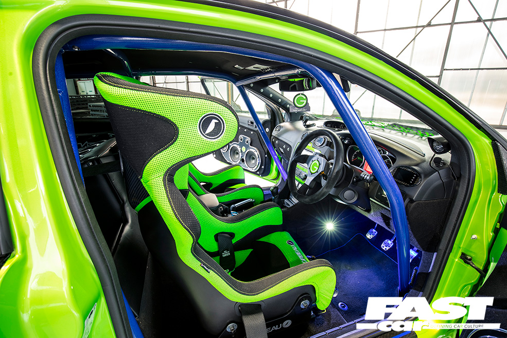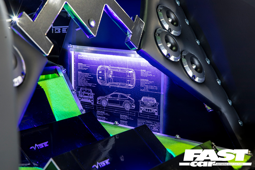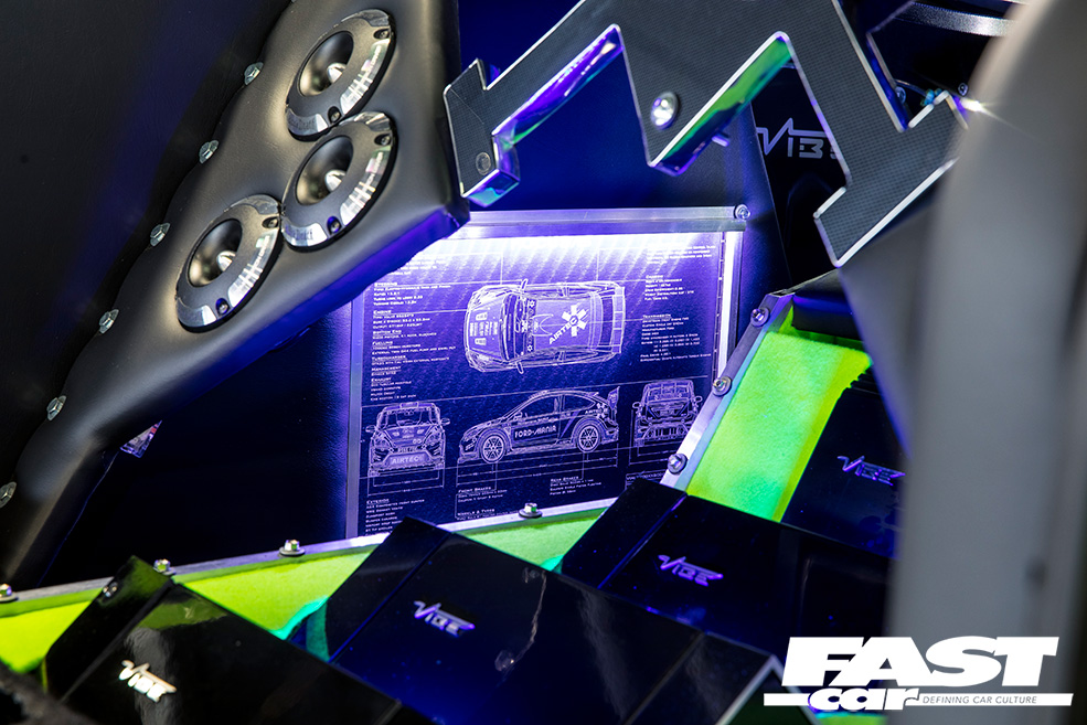 Sparco snap-off steering wheel, custom Corbeau seats with custom MJG Grits brackets, Sparco harnesses, Jamsport rollcage – powdercoated in custom blue sparkle, carbon panel trims and FYD logo, Toucan touchscreen for Syvecs, Little Devil custom vent pods, touchscreen system for in-car lighting, carbon RS Fox gearknob, Kuro fire extinguisher, flocked dash and trim, boot build comprising 3x Vibe Black Air S4 amps, 1x Vibe M4K mono class D amp, 3x Vibe Black Death component speakers, 4x Vibe 8″ Black Death mid-range speakers, 6x Vibe Black Death 15″ SPL subwoofers, Yellow Top secondary battery, 2x Black Art graphics, Mk2 RS plaque designs.